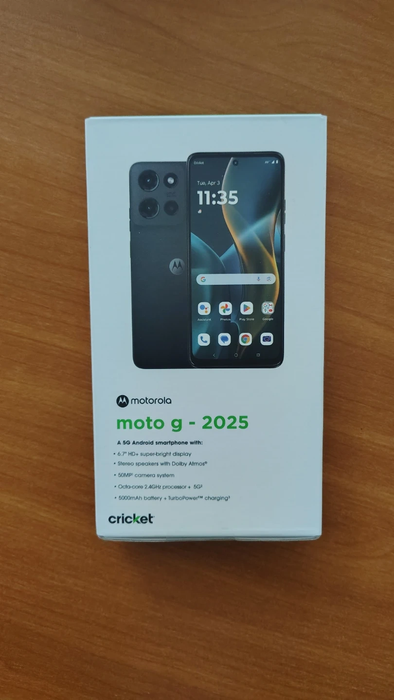 Brand new, sealed Motorola Moto G 2025 smartphone. It's a 5G Android device with a 6.7-inch HD+ display. Features a 50MP camera system and a 5000mAh battery with TurboPower charging.