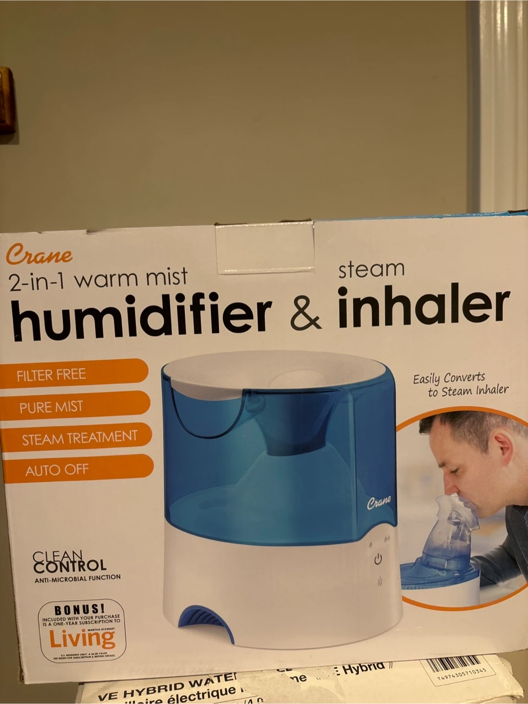 76I have a Crane 2-in-1 warm mist humidifier and inhaler for sale! It's filter-free and features pure mist, steam treatment, and auto-off functions. It easily converts to a steam inhaler and has clean control with anti-microbial function. Also includes a bonus one-year subscription to Living magazine. The box is included! Never used.
