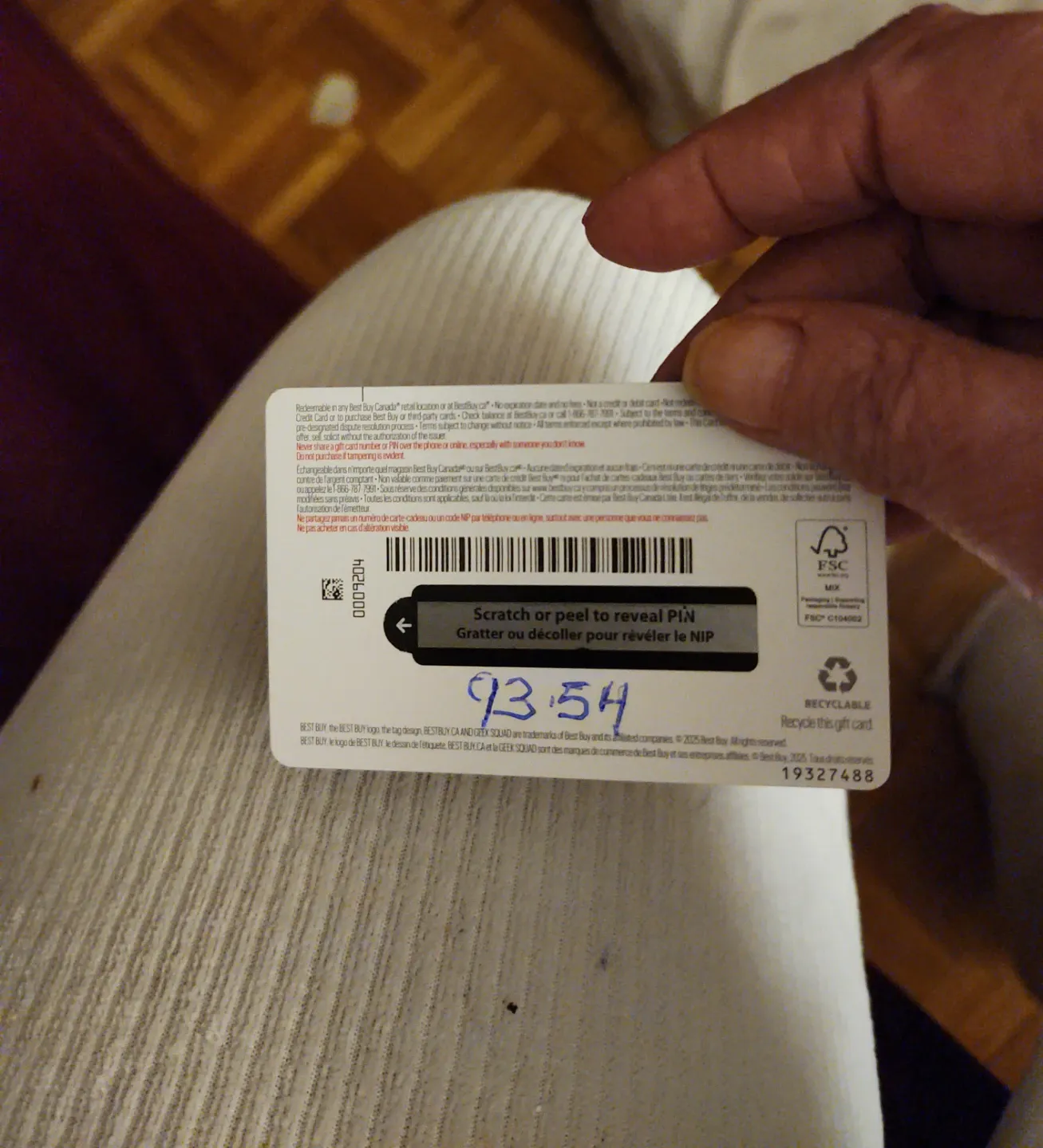 This is a Best Buy gift card with a balance of $93.54. It's redeemable at any Best Buy Canada retail location or online. The card is recyclable.