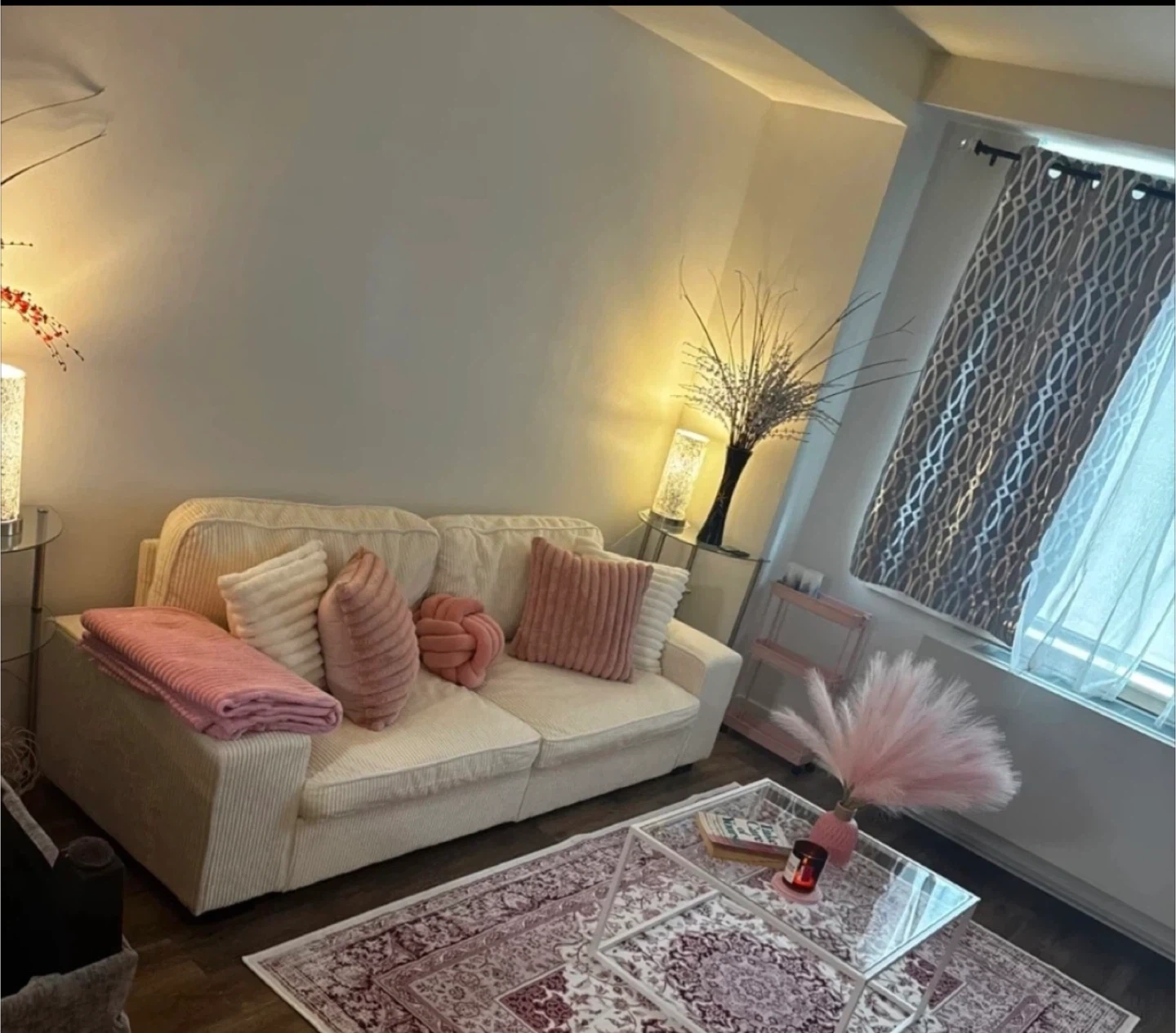 69Selling a comfy cream-colored corduroy sofa! It's in great condition and would look lovely in any living room. The sofa has a soft texture and a neutral color that can easily match different decor styles. Perfect for lounging and relaxing! Pillows not included