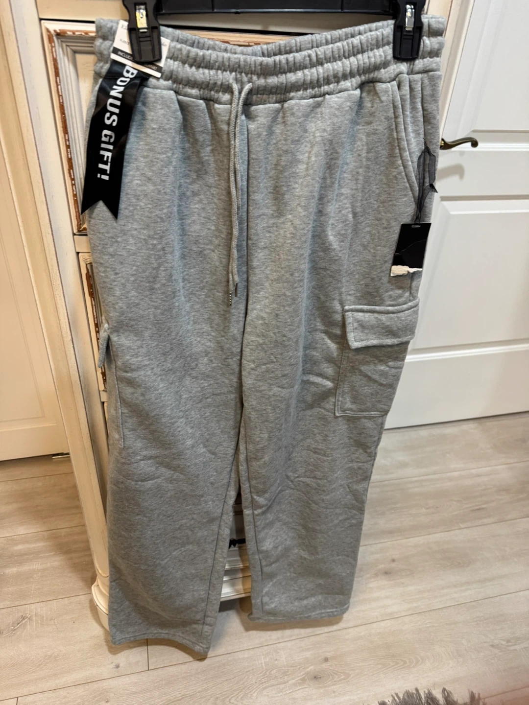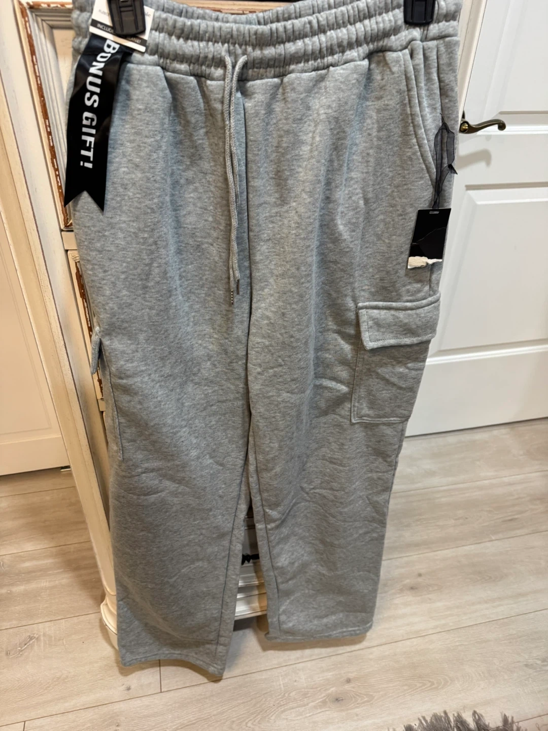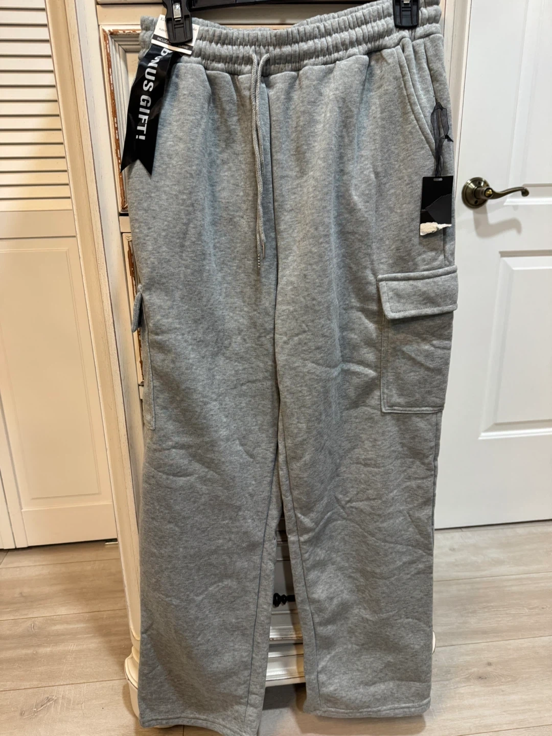 Grey sweatpants with cargo pockets. Elastic waistband with drawstring. Tag attached.