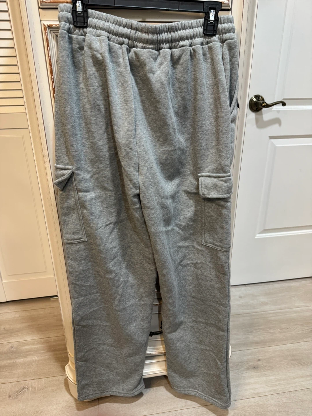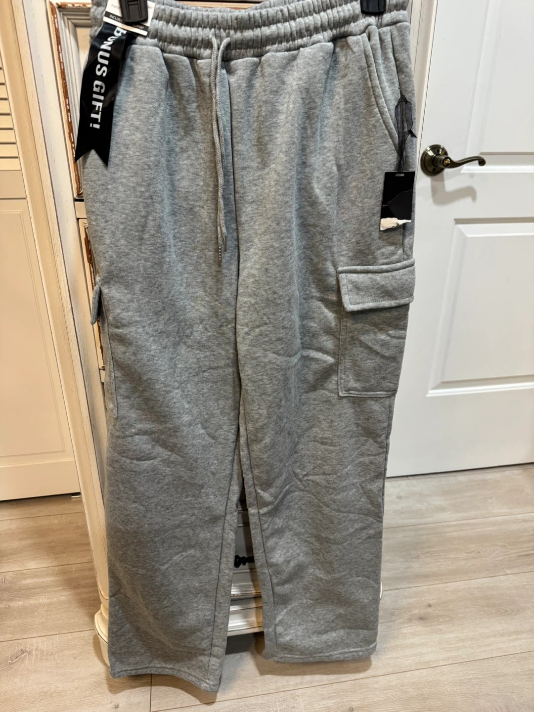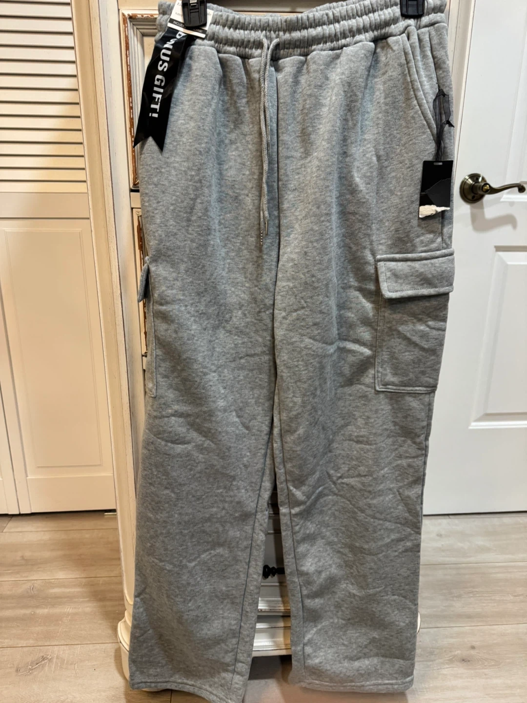 Grey sweatpants with cargo pockets. Elastic waistband with drawstring. Tag attached.