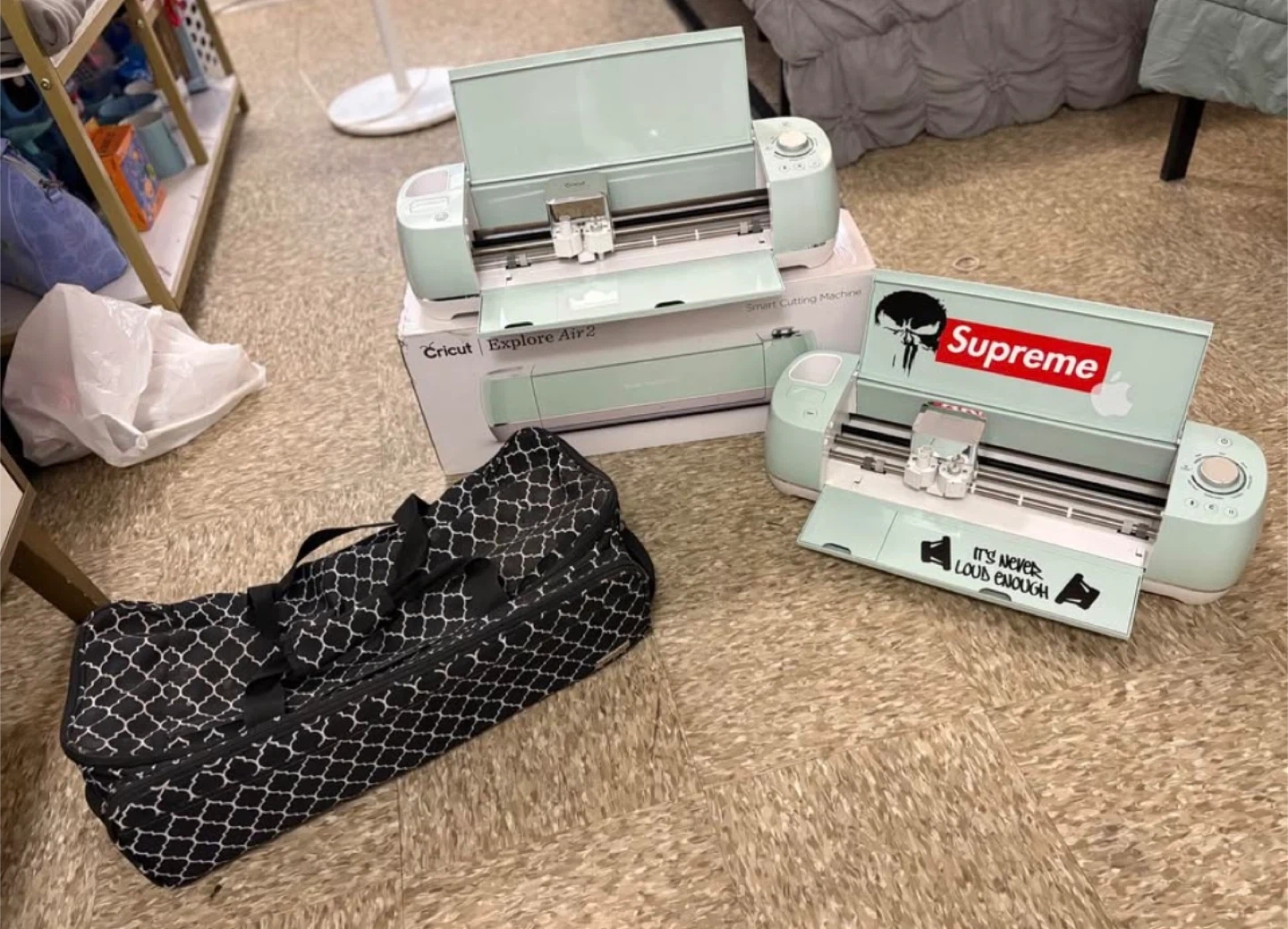 60Selling 2 Cricut Explore Air 2 machine with a variety of accessories and supplies. This includes several cutting mats in different colors and sizes, as well as transfer sheets and other crafting materials. Perfect for all your DIY projects!