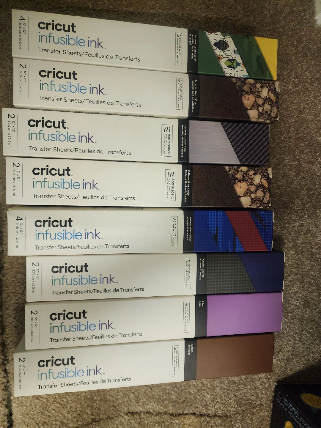 I'm selling a variety of Cricut Infusible Ink Transfer Sheets! Each sheet measures 12" x 12". $100 for everything. of 15 per roll Available patterns include: - Jungle Safari - River's Edge - Carbon Fiber - Cosmo - Lilac - Windbreaker - Suntan