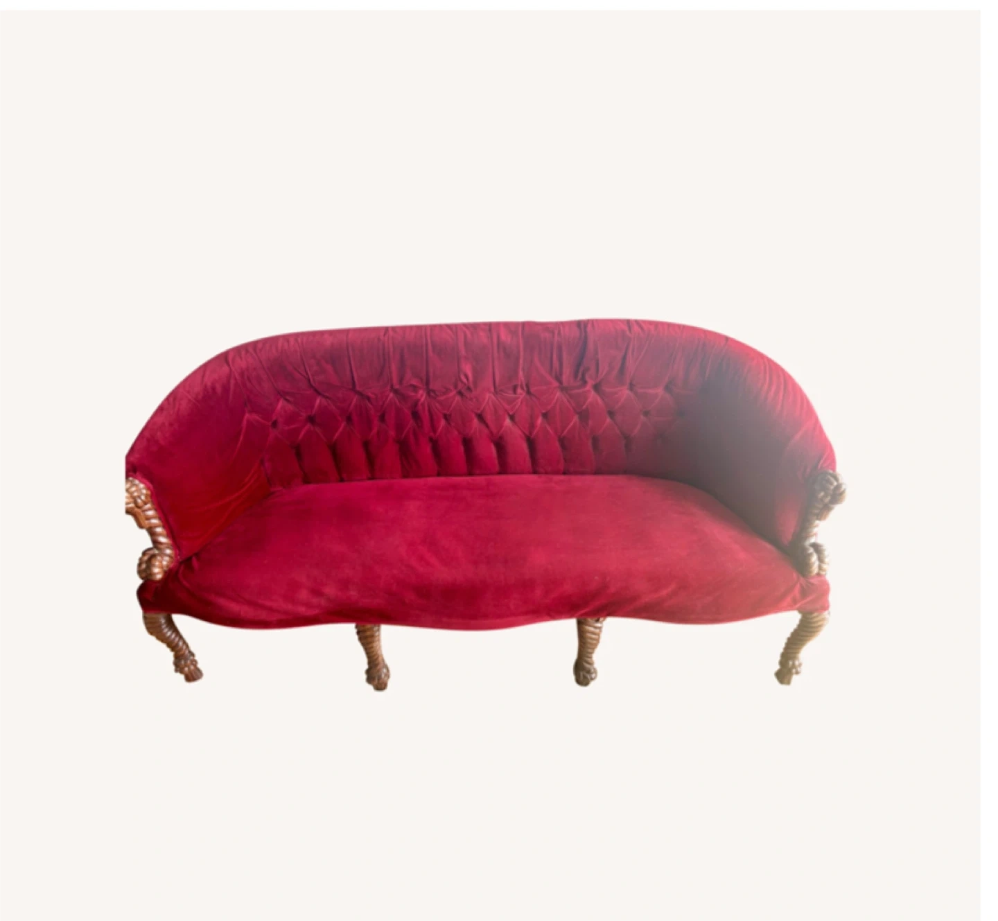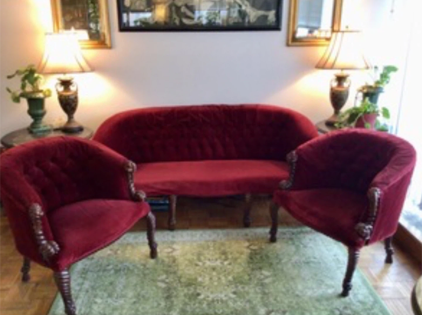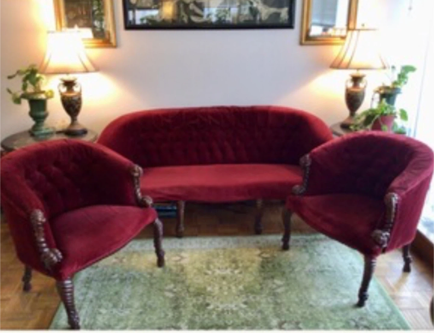 65Selling a beautiful 3- piece set of sofa and 2 matching arm chairs. Vintage set! It's a stunning combo that would add a touch of elegance to any room. The crimson chairs and sofa feature a classic design with intricate detailing on the legs. All in great condition and ready to find a new home! Sofa measures 30” H x 62 ” W x 22” D. The 2 armchairs measure 30”H x 27”W x 22”D. All pieces have well been taken care of. No smoke. No pets. Clean and intact.