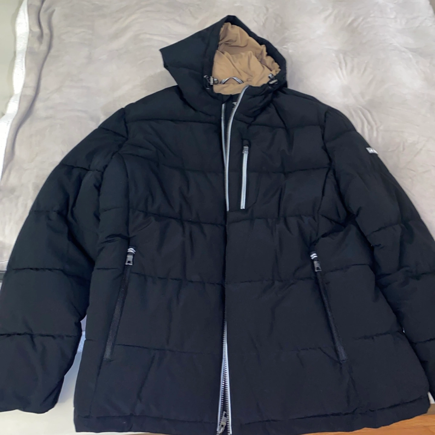 Black puffer jacket. Water resistant, wind resistant, and active stretch. Size XL.