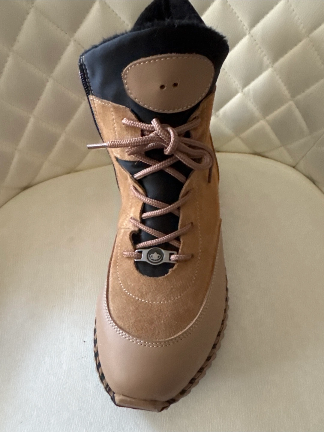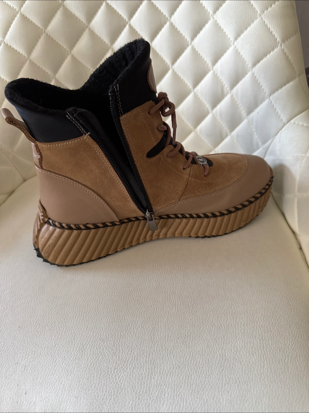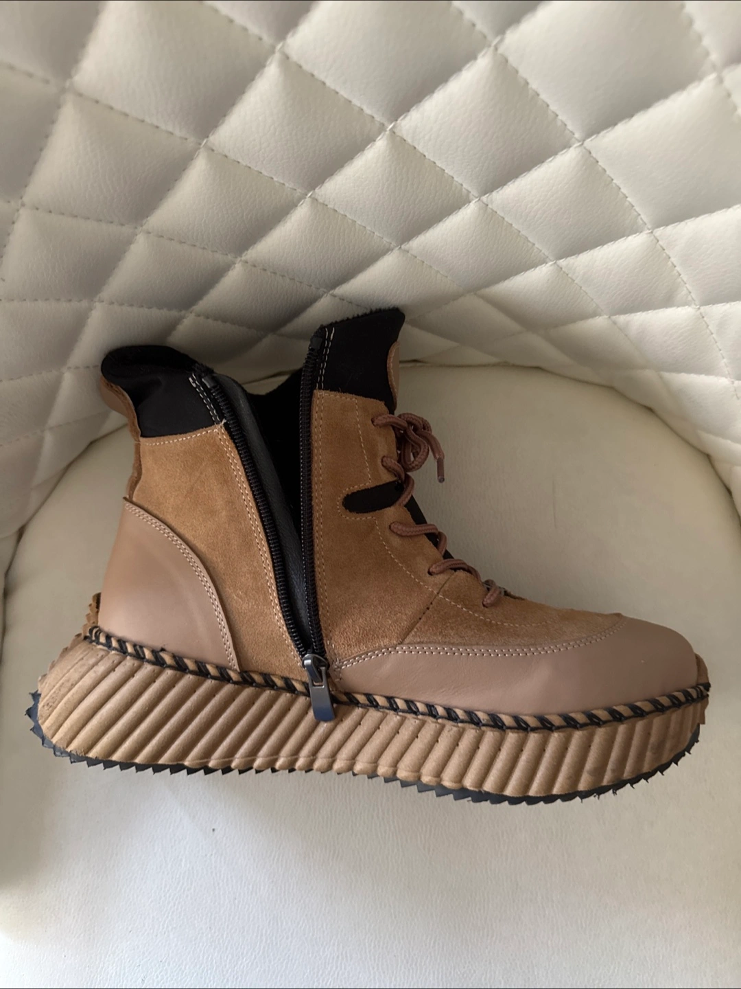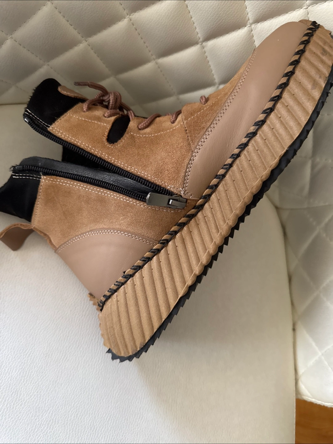 Selling a pair of Crown Vintage ankle boots in a beautiful tan color! These boots feature a stylish combination of leather and suede, making them both fashionable and durable. They have a unique lug sole design and a convenient side zipper for easy wear. Perfect for adding a touch of vintage charm to any outfit!