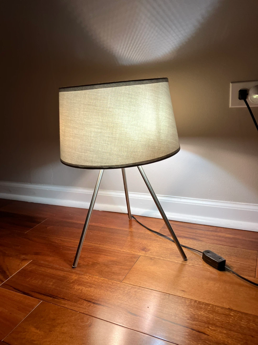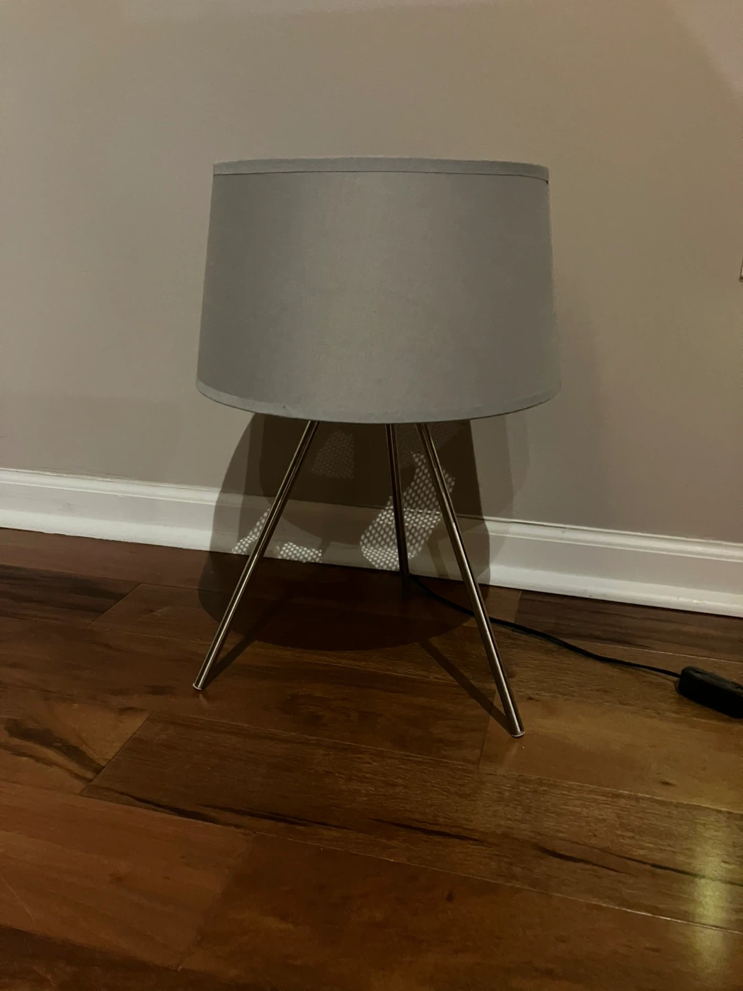 This stylish table lamp features a modern tripod base with a gray drum lampshade. It's perfect for adding a touch of ambient light to any room. The shade is made of fabric with a dark trim. With free LED bulbs. Cash and pick up only.