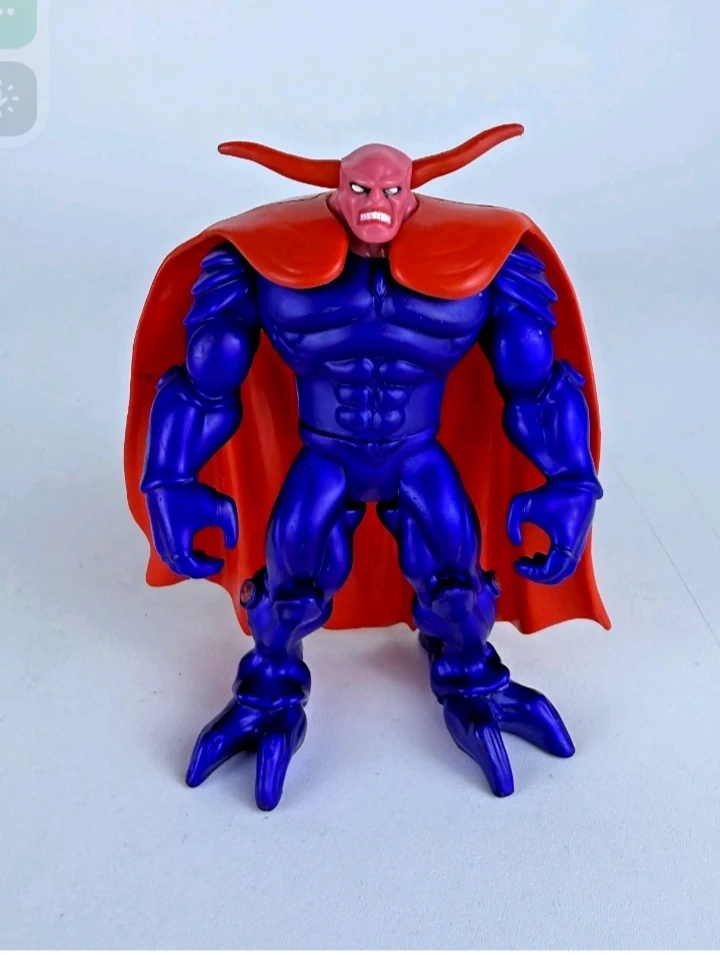 This is a vintage 1995 ToyBiz X-Men Brimstone Love action figure, Marvel action figure with a purple body and red cape. It has horns and a distinctive head sculpt. The figure is made of plastic.