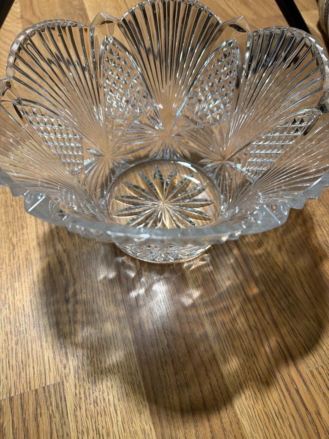 Selling a beautiful crystal bowl! It has a lovely starburst pattern on the bottom and a scalloped edge. Perfect for serving or as a decorative piece