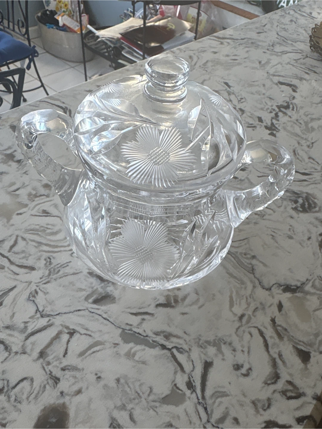 10Here's a lovely crystal sugar bowl with a lid. It has a beautiful floral design and would look great on any table!