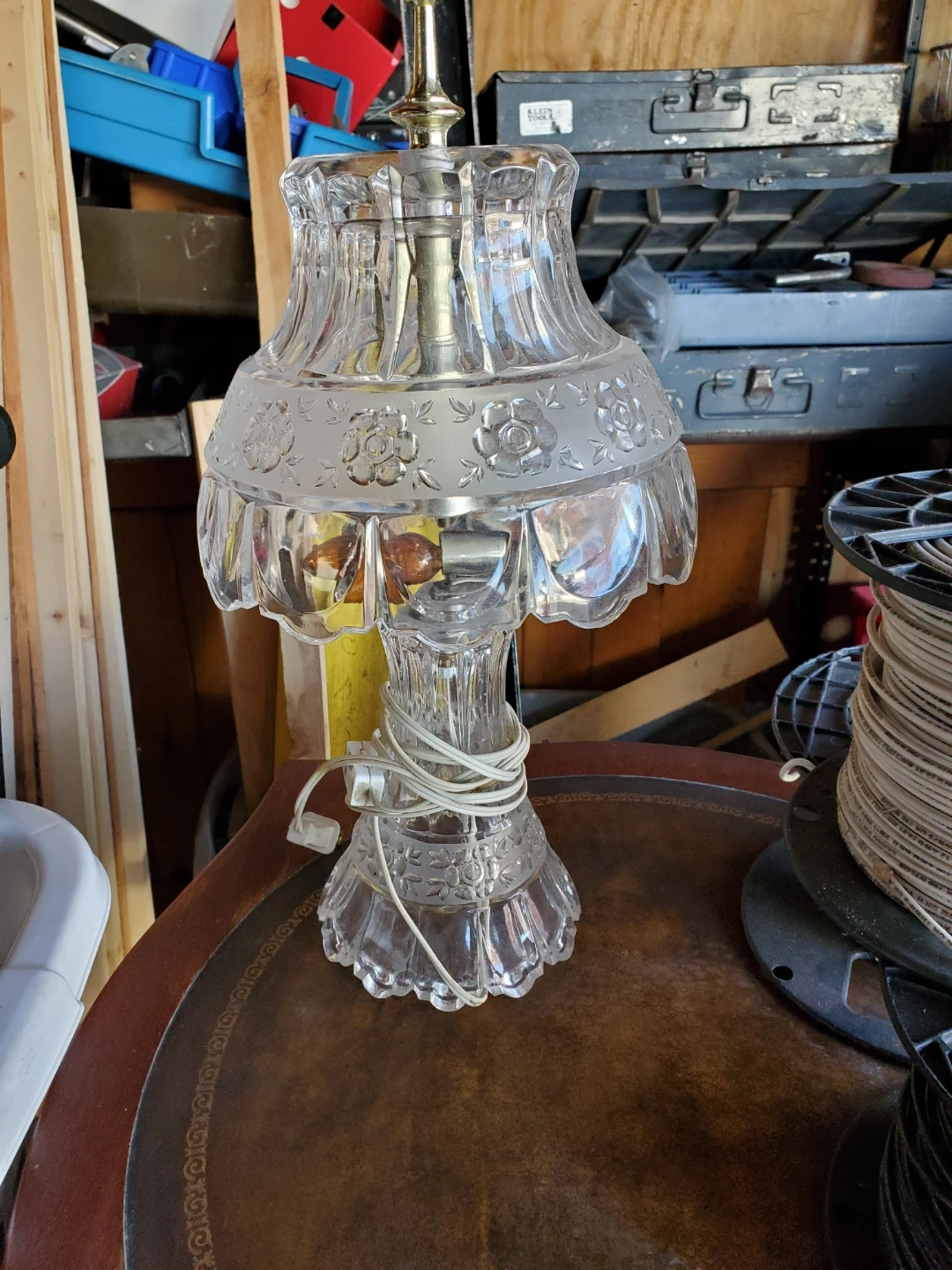 60This is a beautiful crystal table lamp with a delicate floral design. It would add a touch of elegance to any room. The lamp is in great condition and ready to brighten up your space!