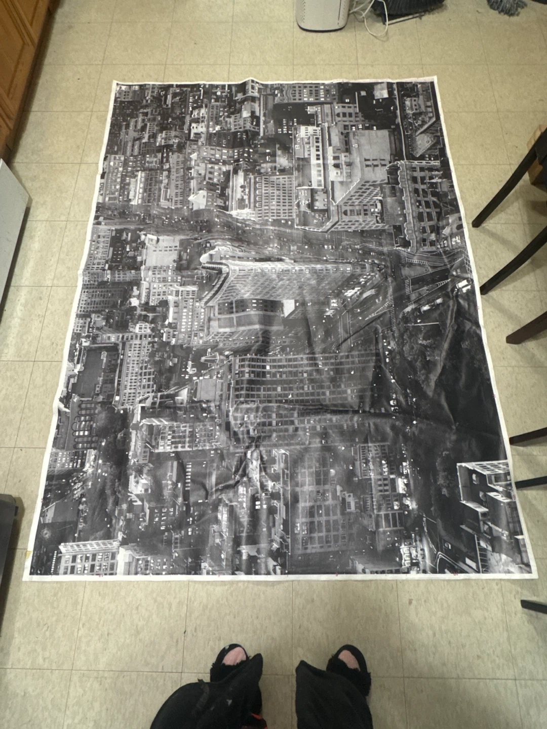 Large black and white wall art print featuring an aerial view of a city. It depicts numerous buildings and streets, giving a detailed urban landscape. This print's monochrome style adds a sophisticated touch to any room.