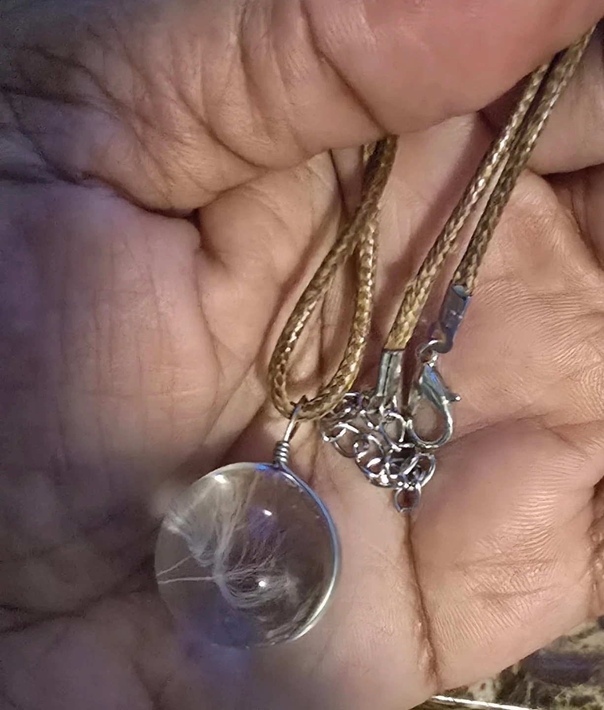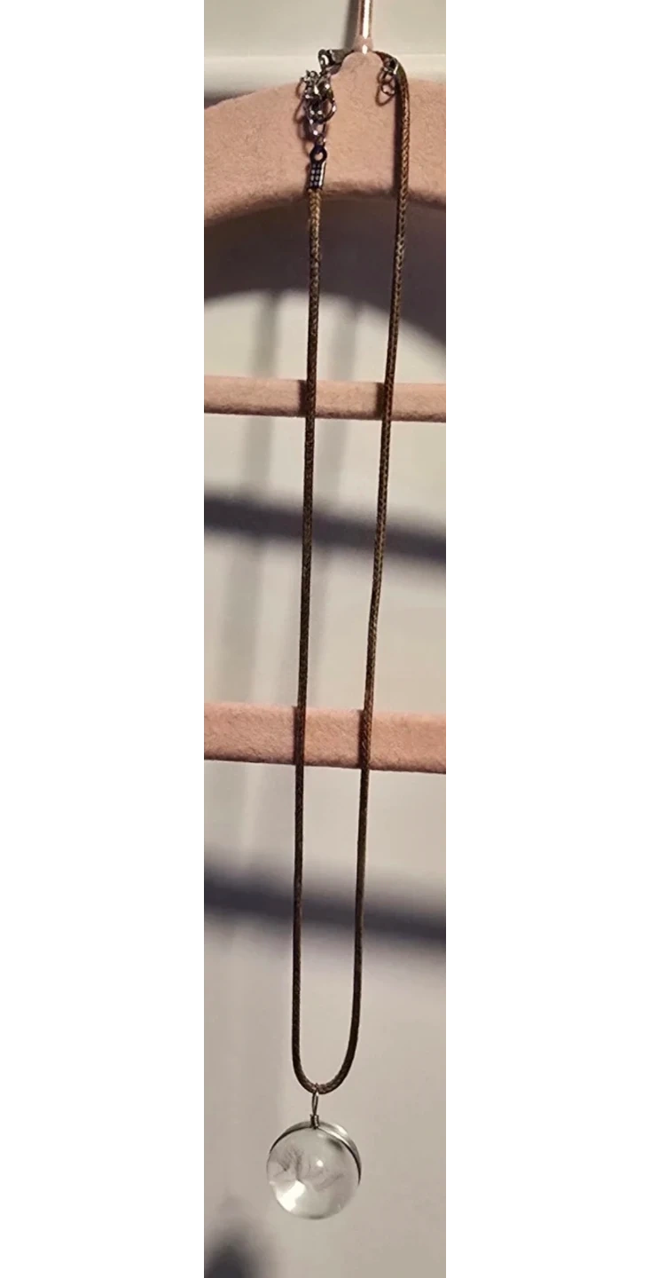 This game made necklace features a clear glass pendant containing a dandelion seed. It has a braided cord and a silver-tone clasp. It's a unique accessory for everyday wear.