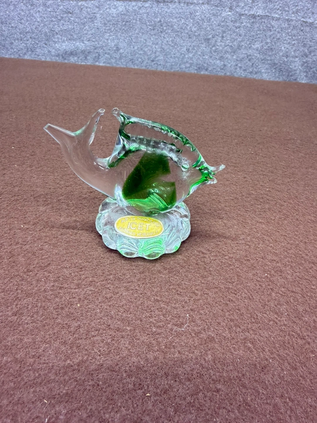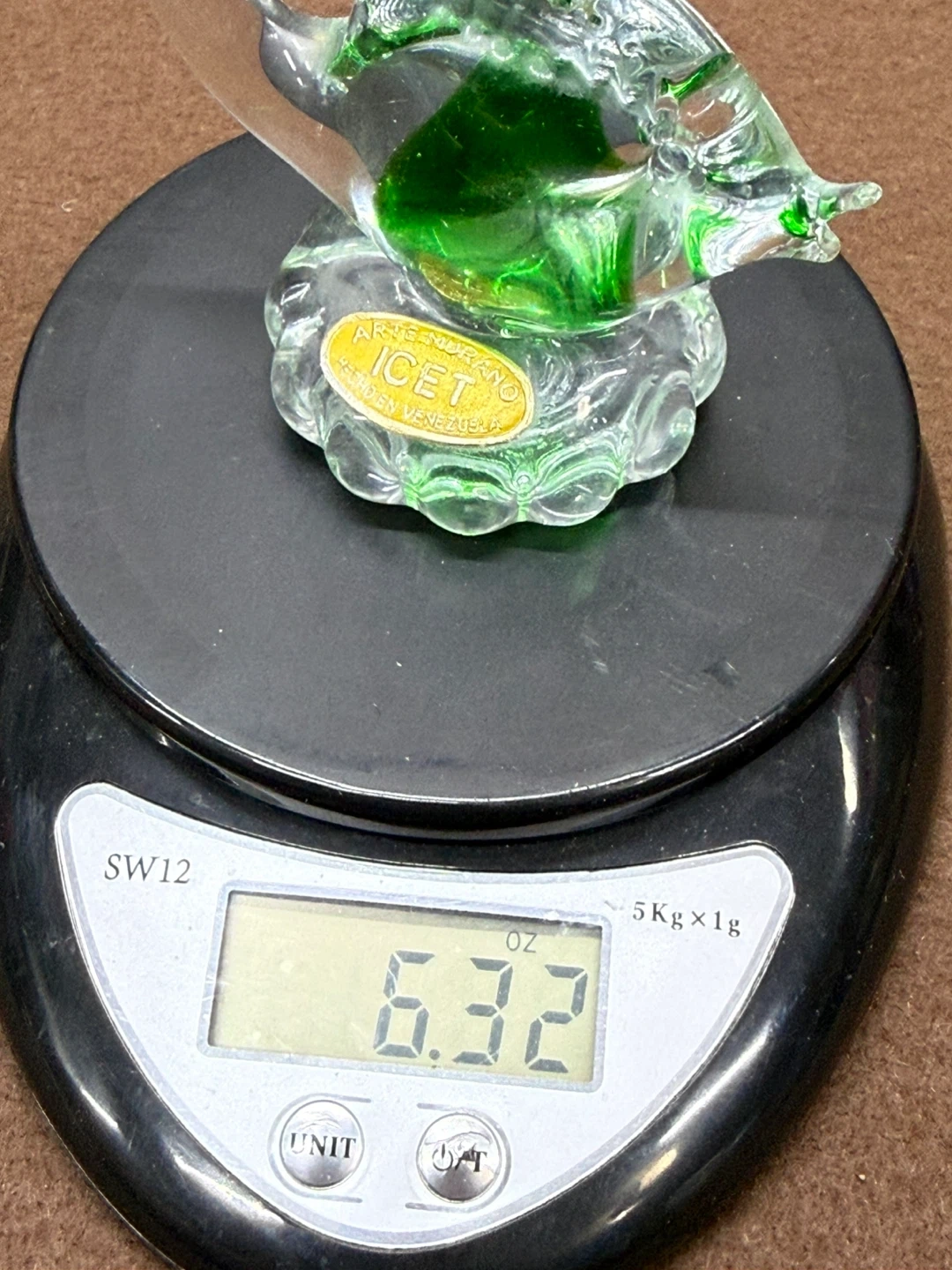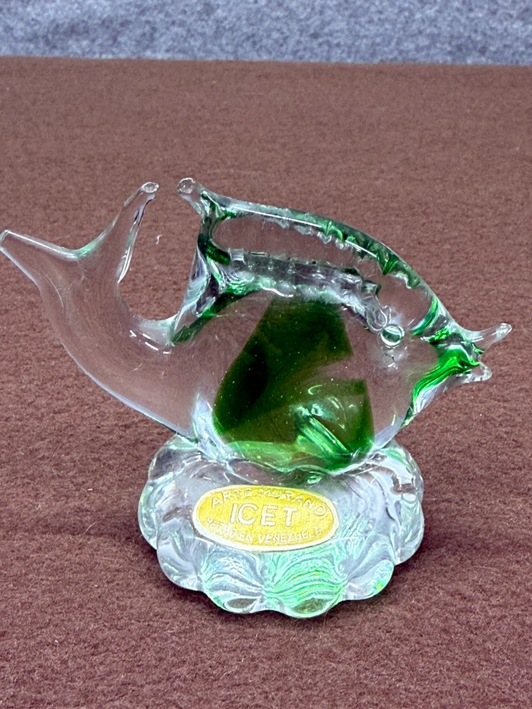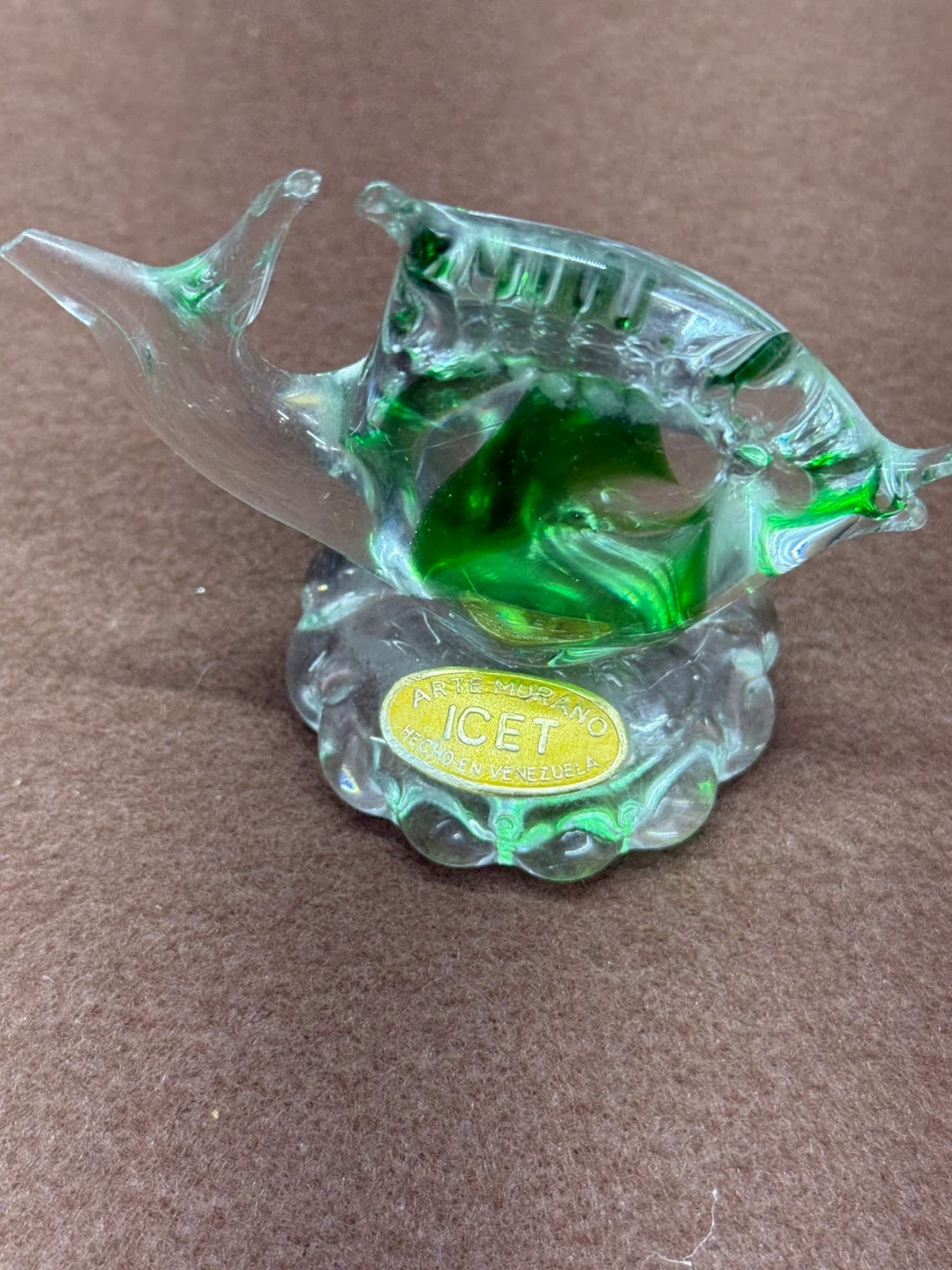 This is a beautiful glass fish figurine with green accents. It's crafted from clear glass with vibrant green glass embedded within. The base is also made of clear glass with a scalloped edge design. It's labeled 'ARTE MURANO ICET HECHO EN VENEZUELA'.