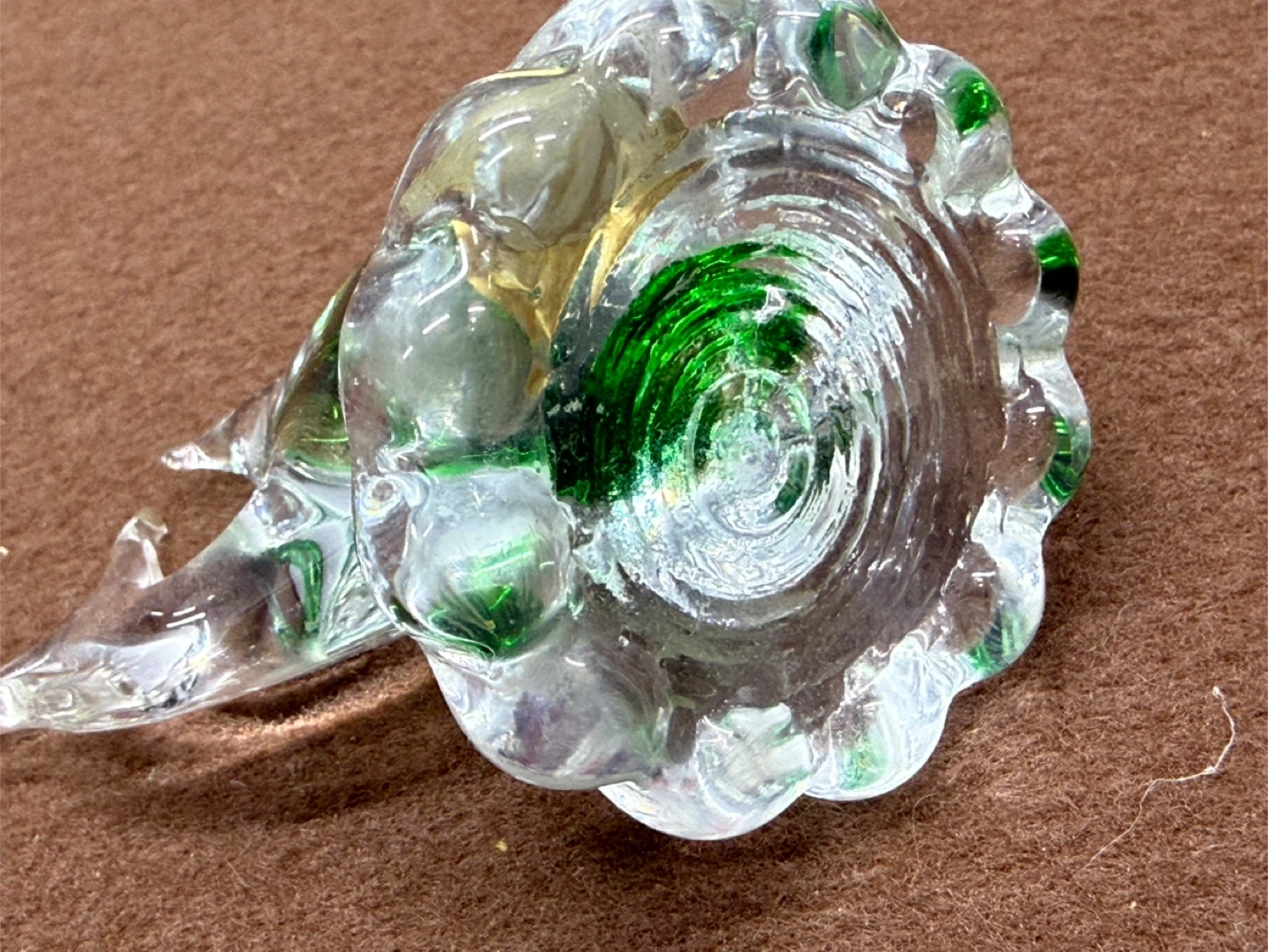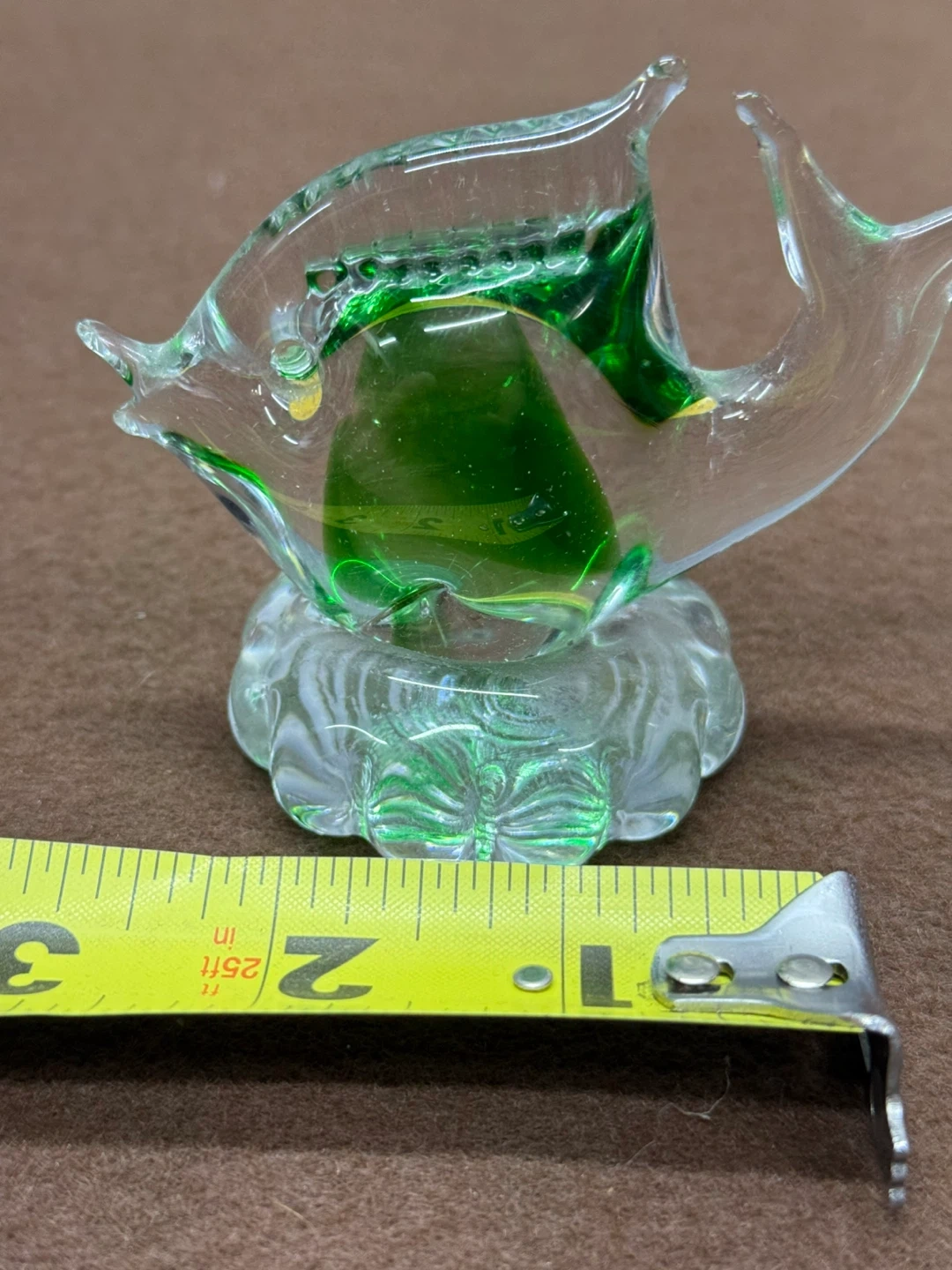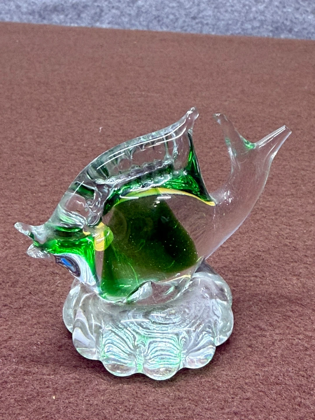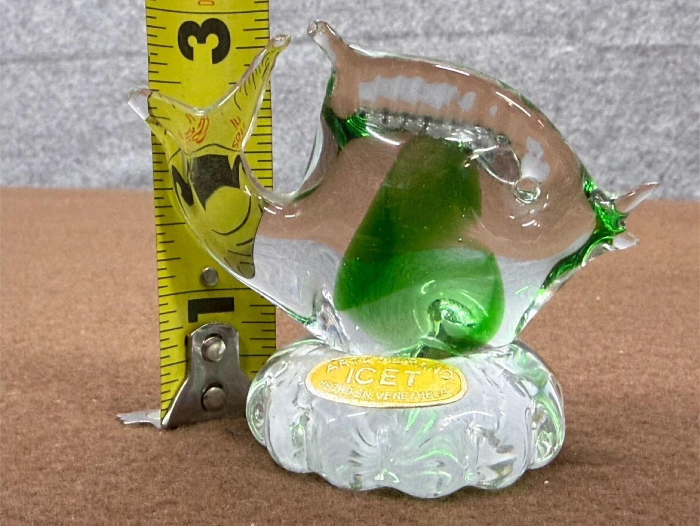 This is a beautiful glass fish figurine with green accents. It's crafted from clear glass with vibrant green glass embedded within. The base is also made of clear glass with a scalloped edge design. It's labeled 'ARTE MURANO ICET HECHO EN VENEZUELA'.