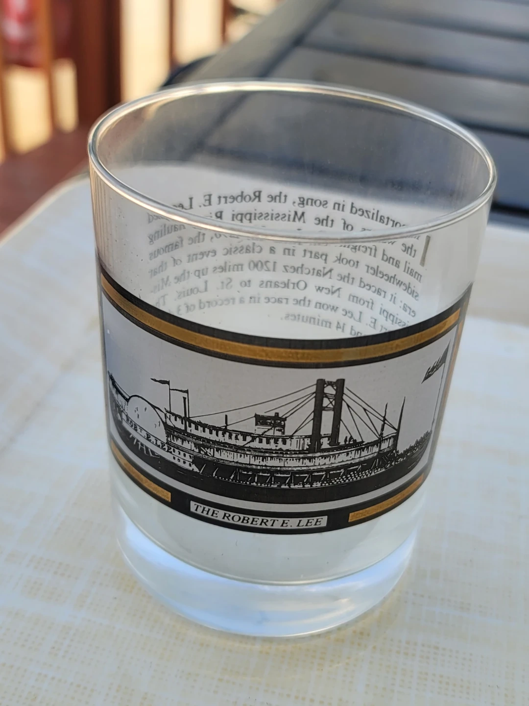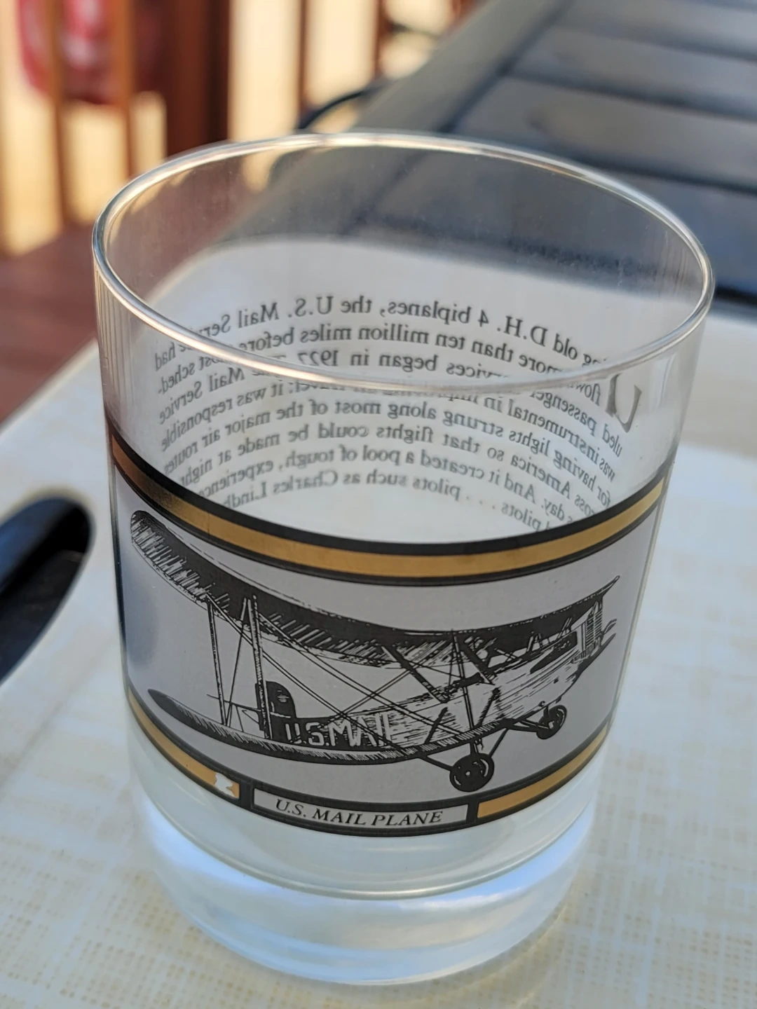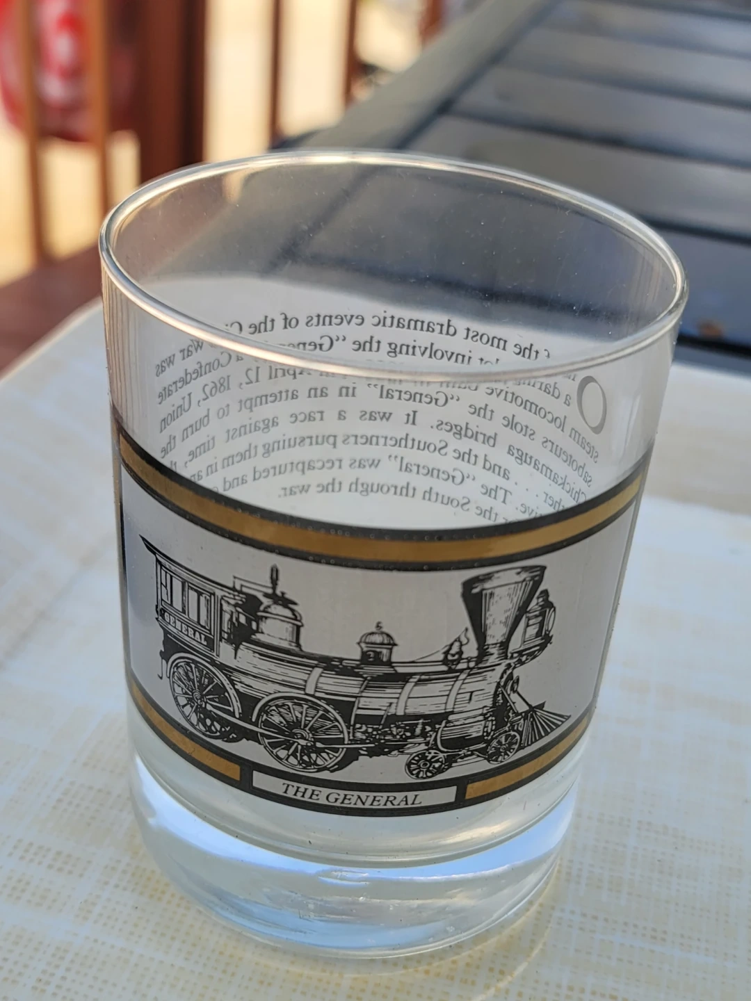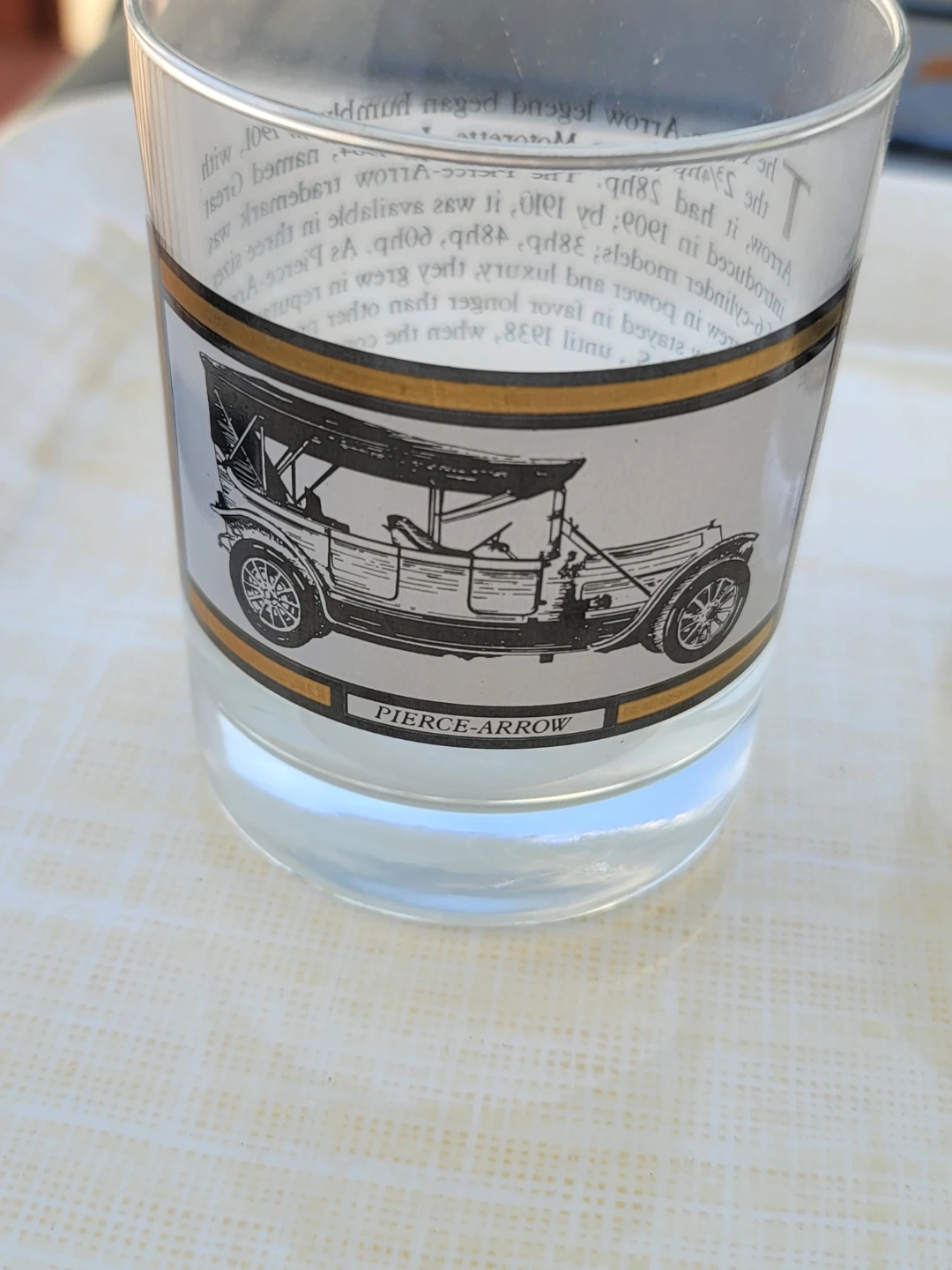 This set includes four collectible glasses, each featuring a different historical vehicle design: The Robert E. Lee steamboat, a Pierce-Arrow automobile, a U.S. Mail Plane, and The General steam locomotive. They're made of clear glass with decorative bands. A great set for collectors!