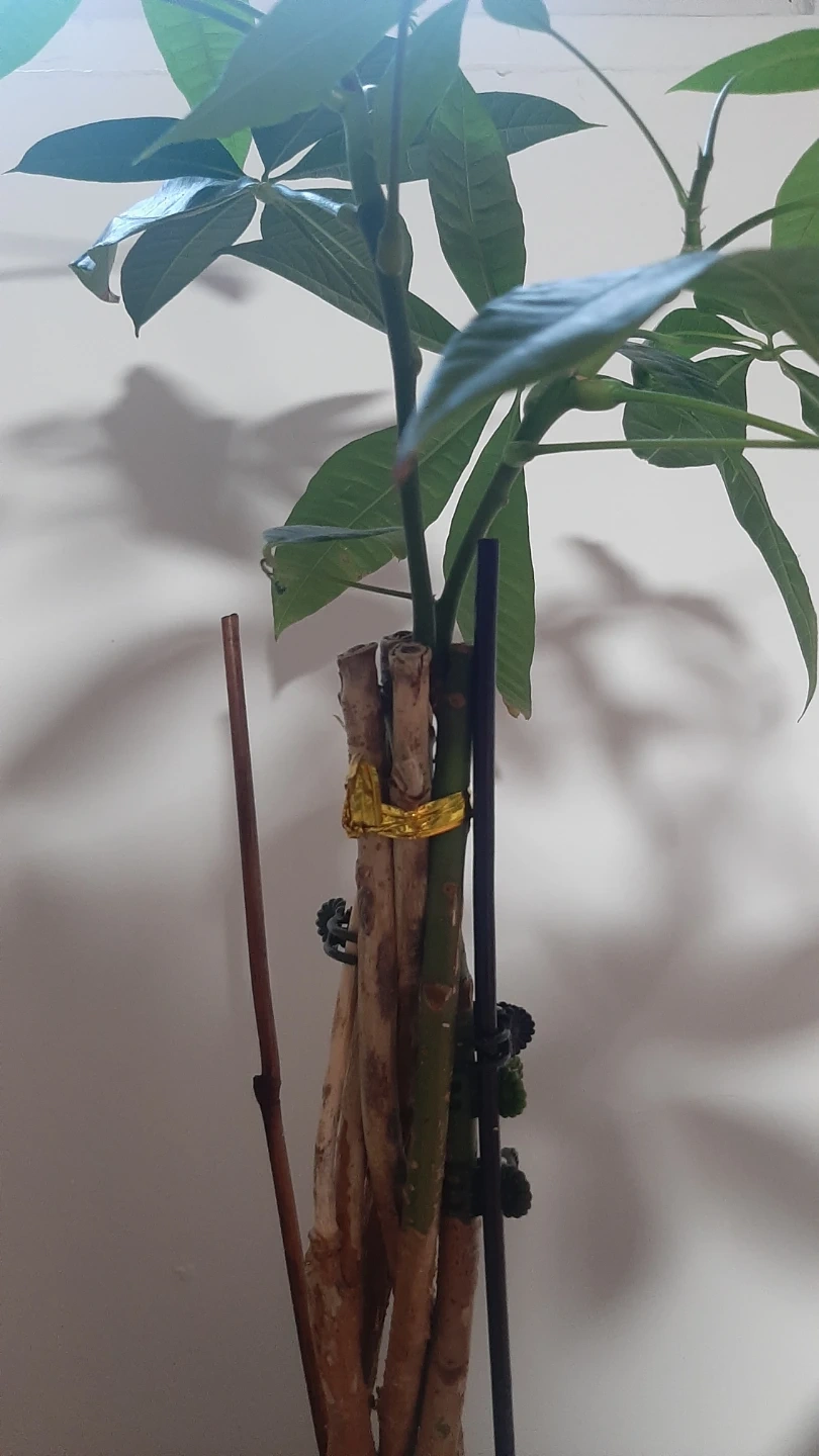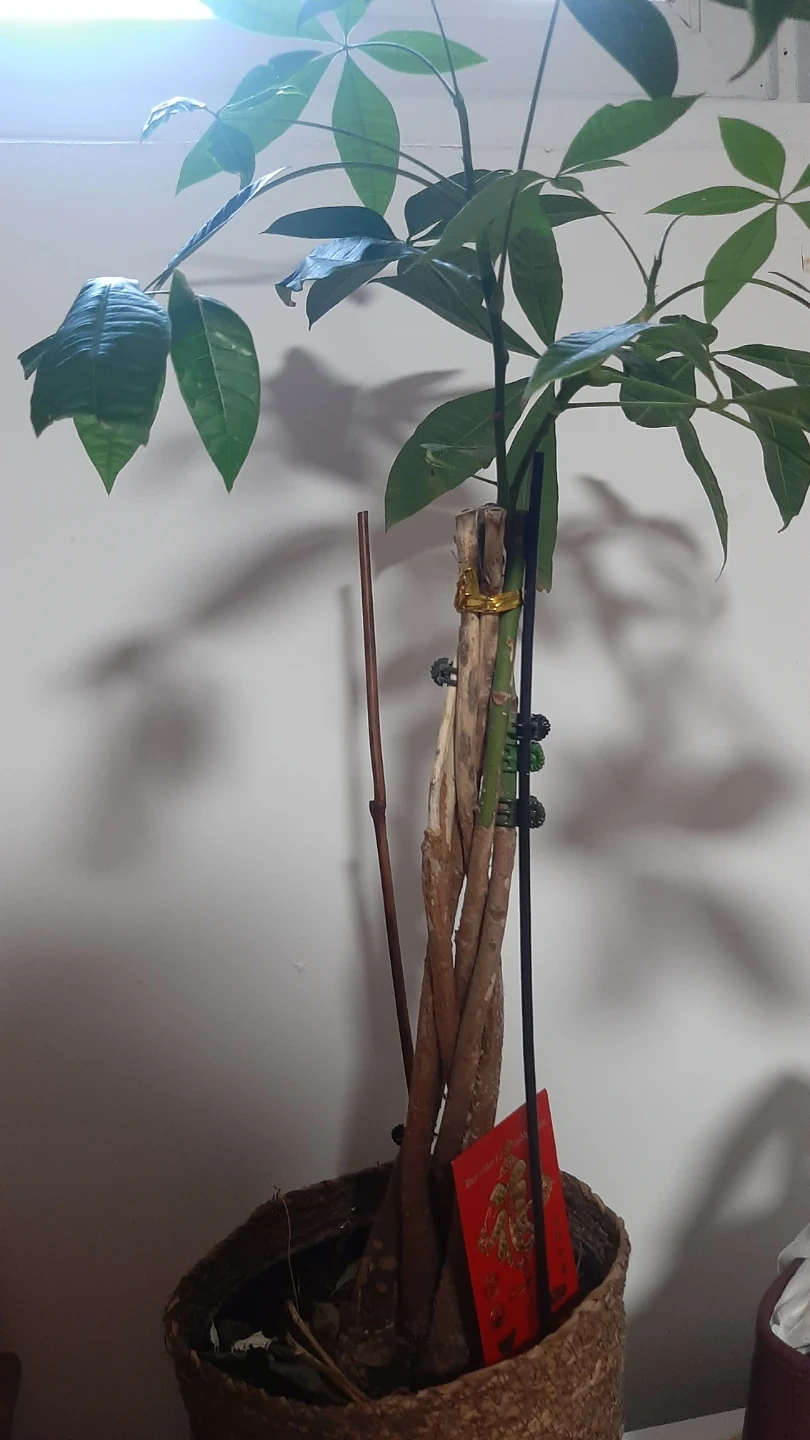 This braided money tree plant comes in a woven basket. It's a classic Feng Shui plant, often associated with good luck. Its vibrant green leaves add a touch of nature to any room. This plant is suitable for indoor environments.