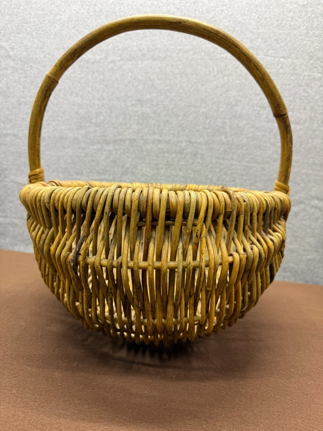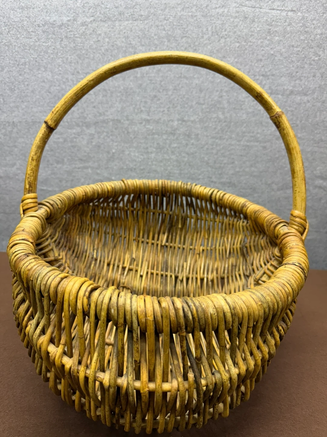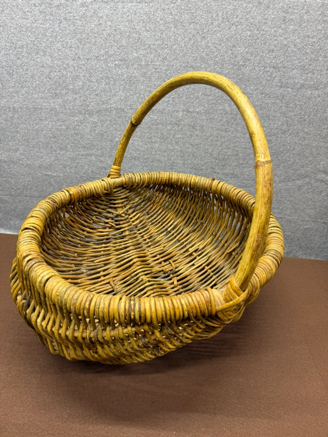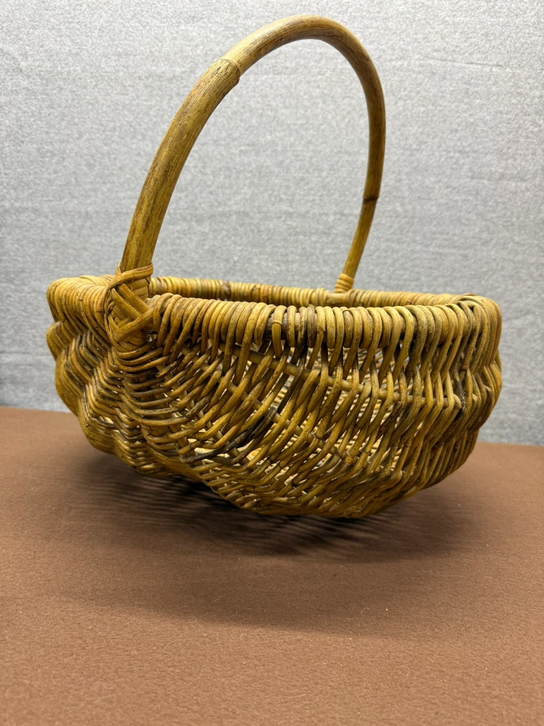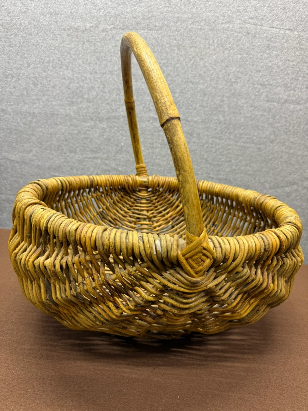 Vintage handwoven wicker gathering basket with continuous handle.