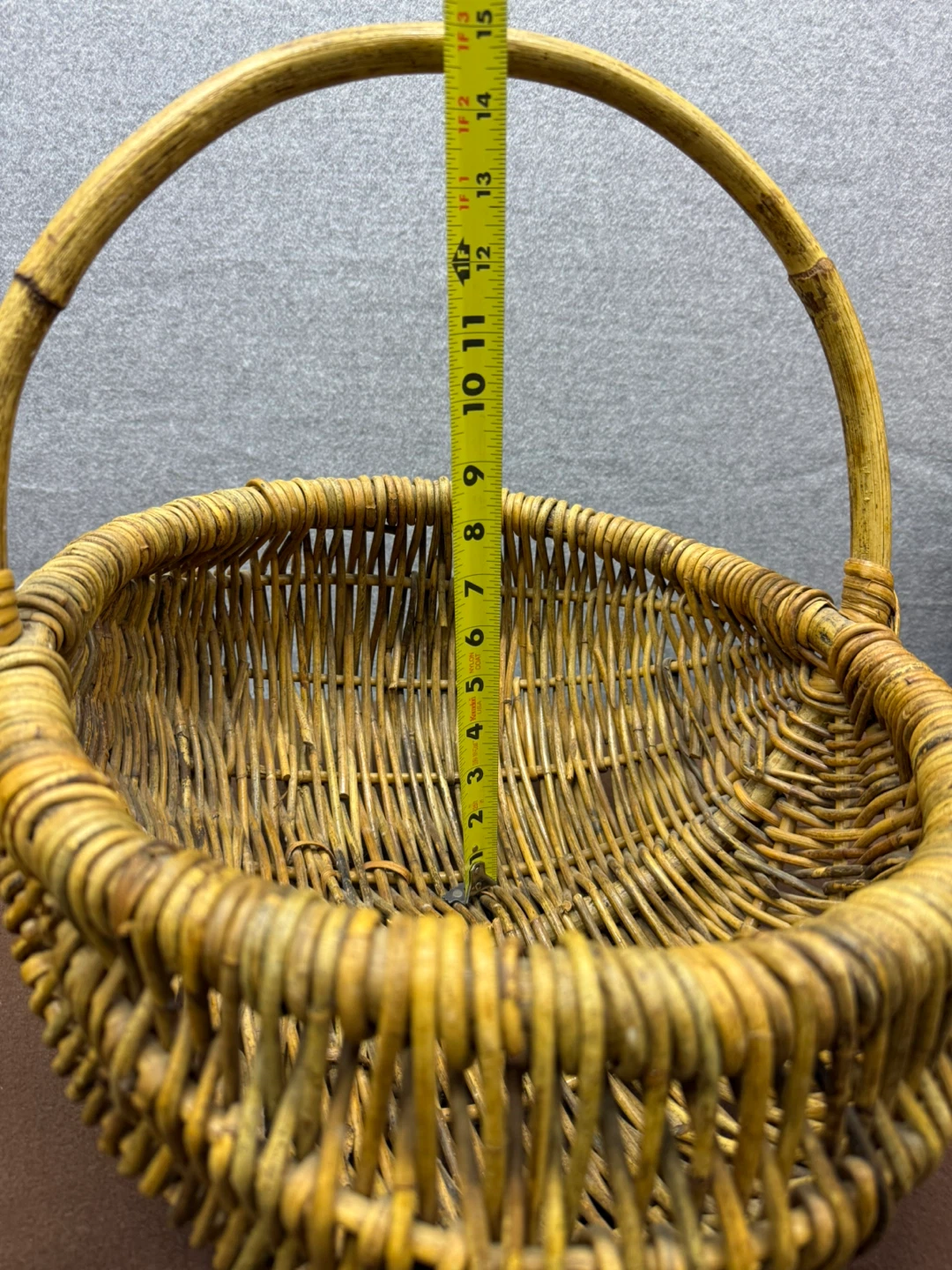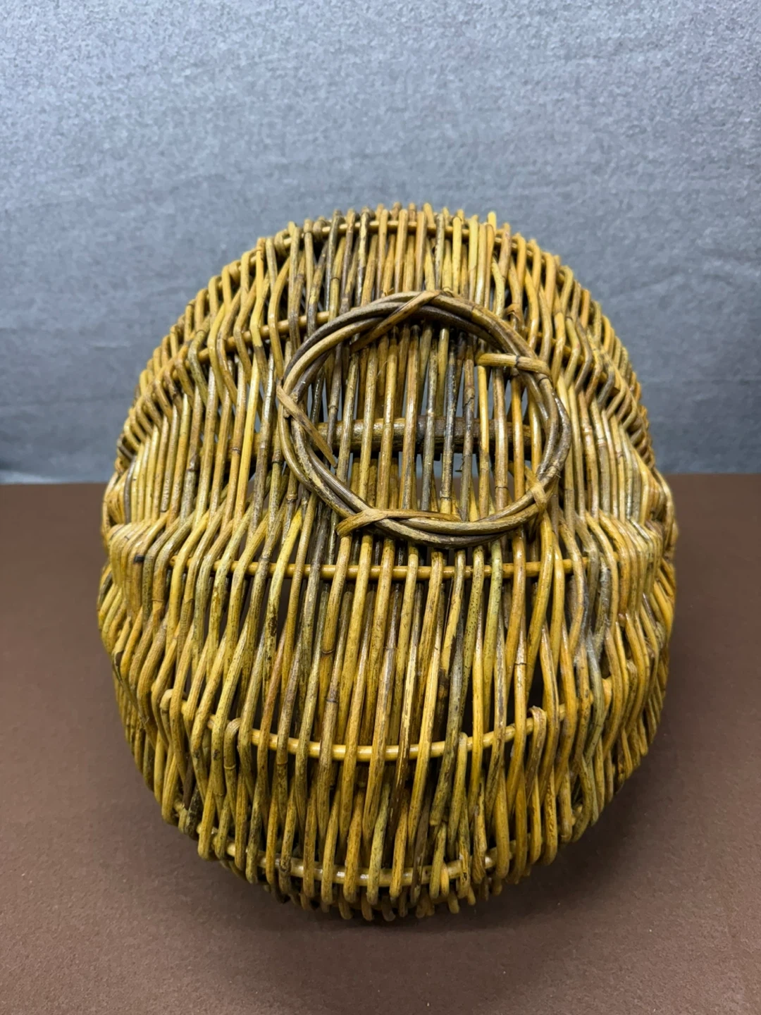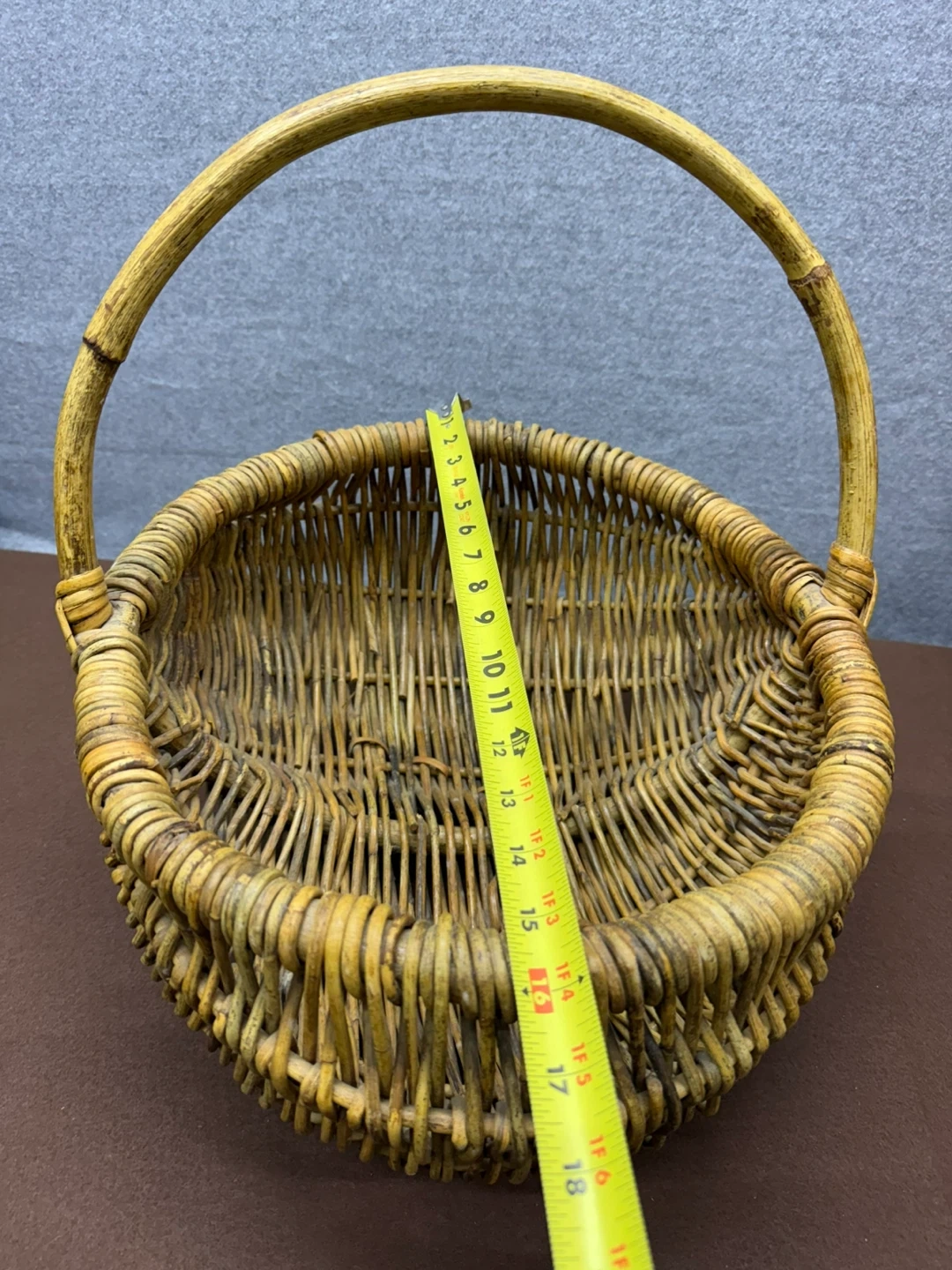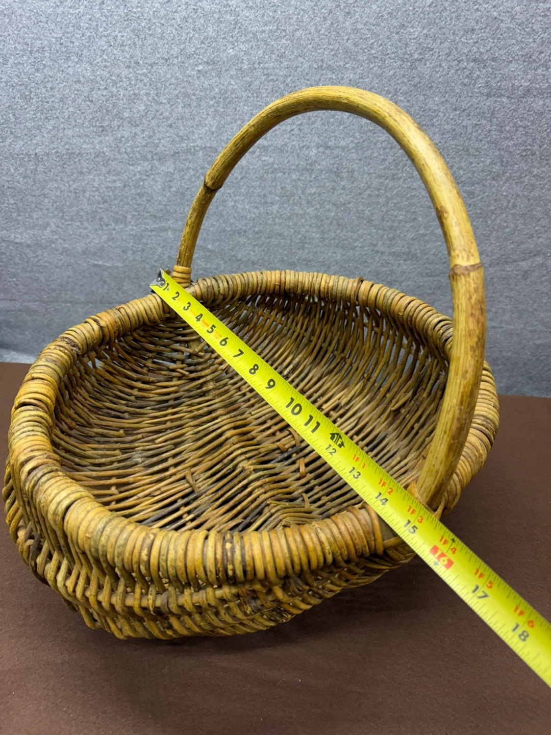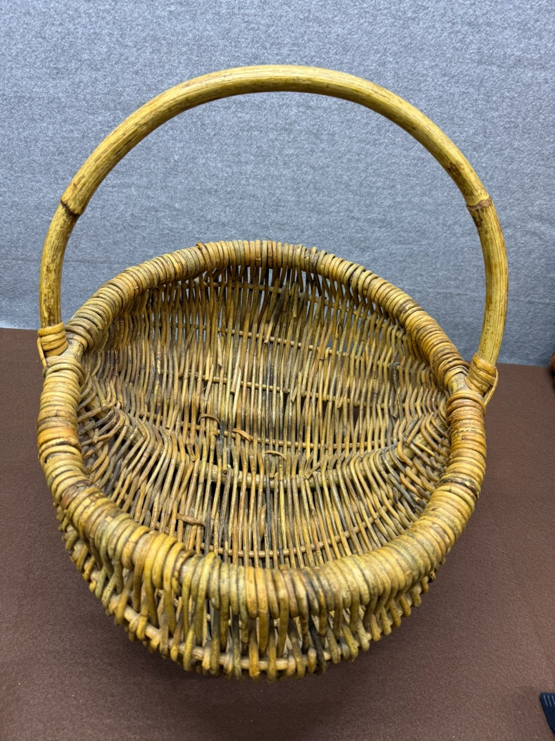 Vintage handwoven wicker gathering basket with continuous handle.