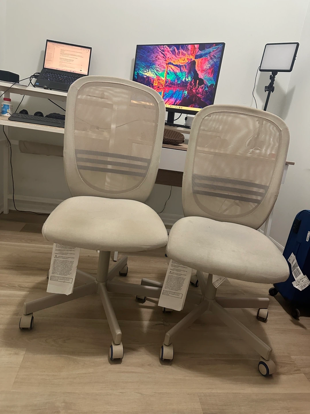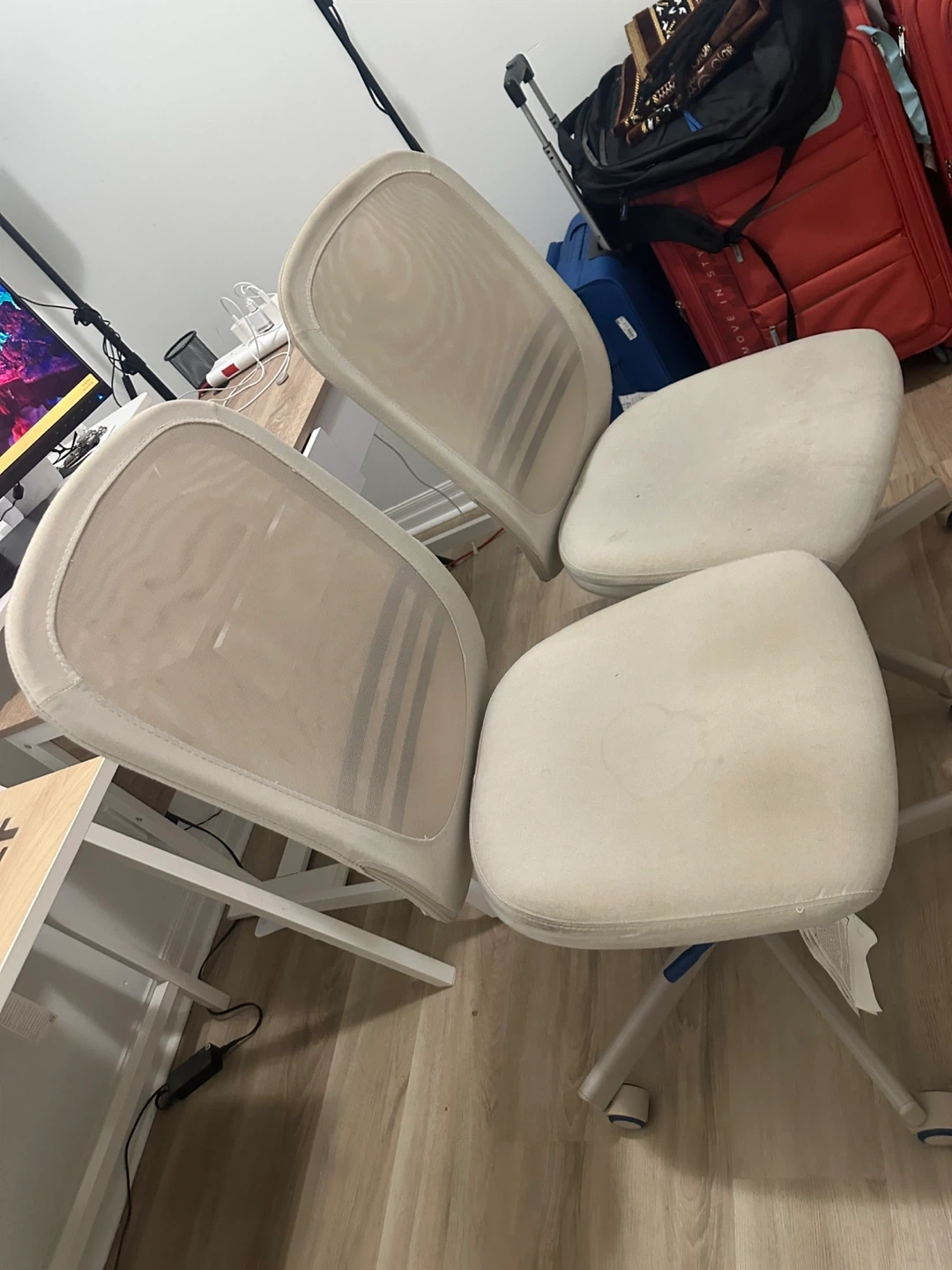IKEA- Two beige office chairs with mesh backs and cushioned seats. They're on wheels for easy movement. These chairs are great for a home office or study space. Move out sales , check out my other listings