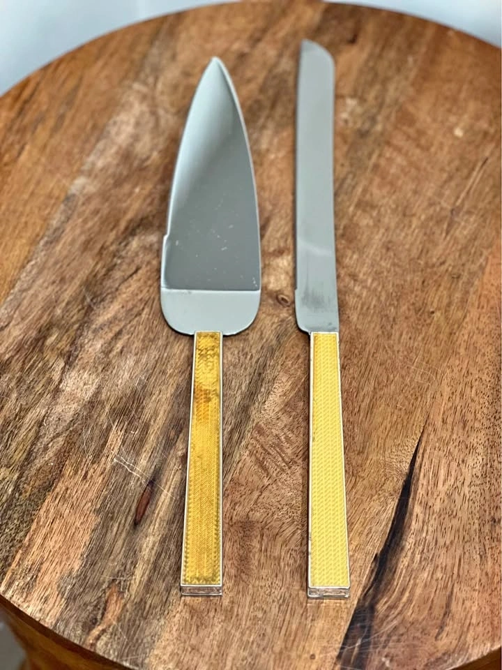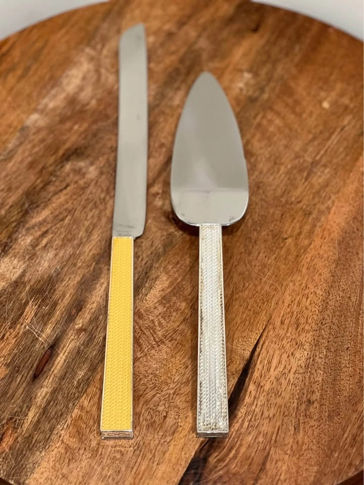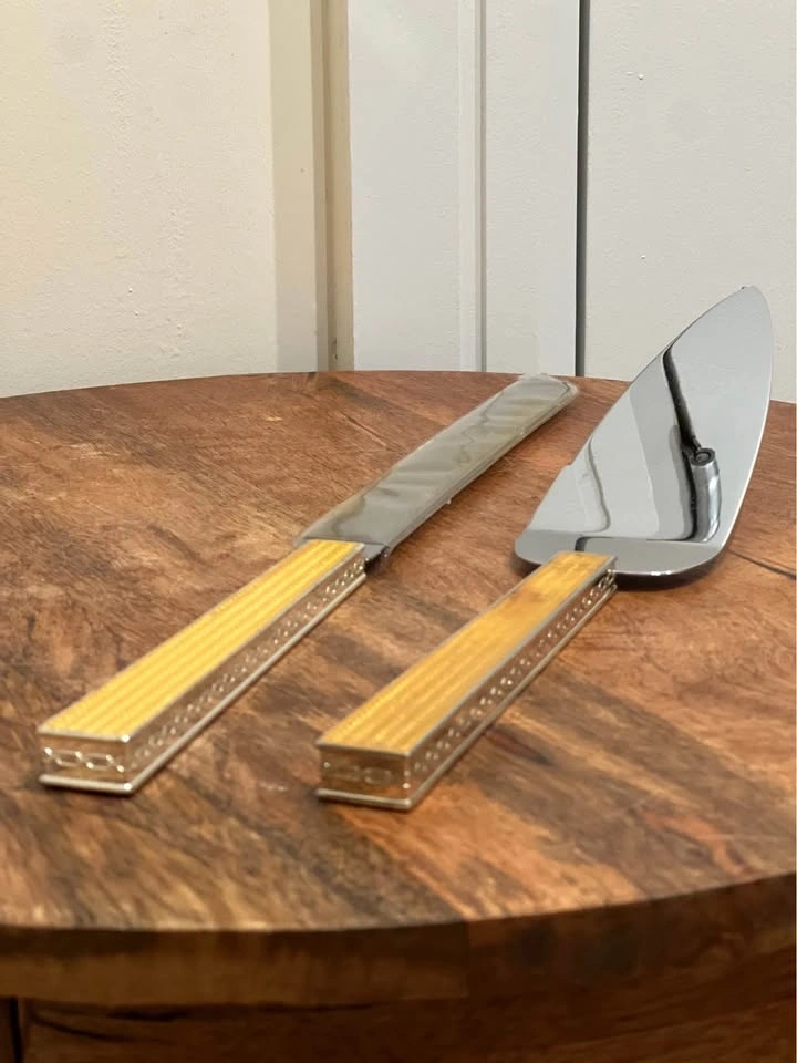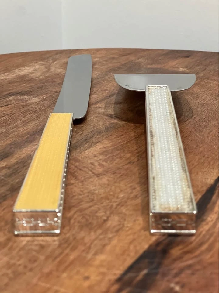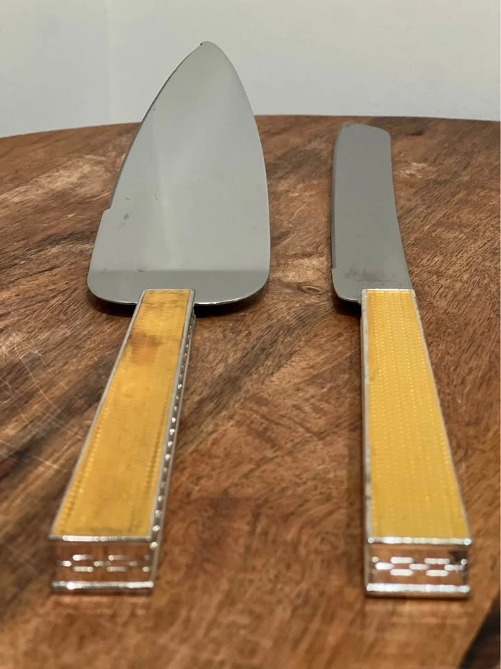 Elegant Vera Wang Wedgwood With Love Nouveau Pearl cake knife and server set. Features silver-plated handles with pearl-toned enamel and an interlocking ring motif. Set includes a 13.25" cake knife and an 11.5" cake server. Made of silver-plated metal with enamel accents. Hand wash only. Modern and sophisticated, perfect for weddings or as a bridal gift. Sold as is - some damage as shown in photos. Pickup at 58th and 7th Ave in midtown Manhattan.