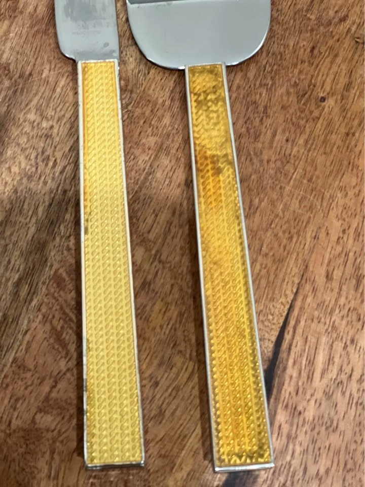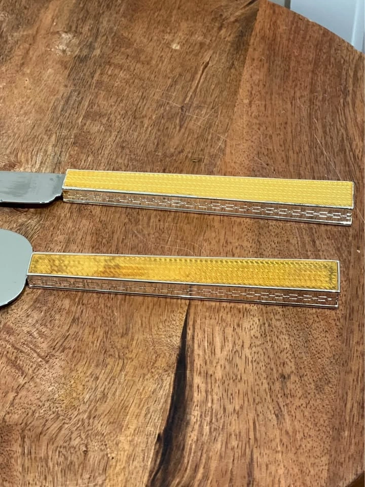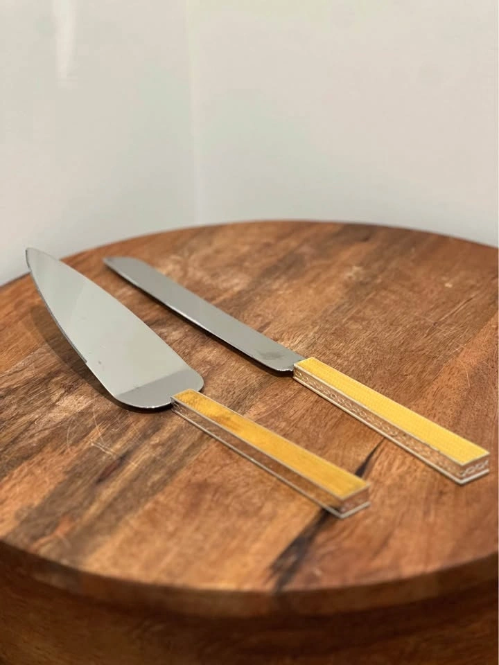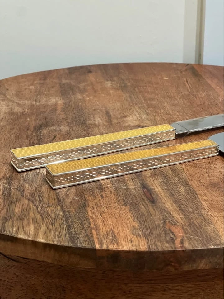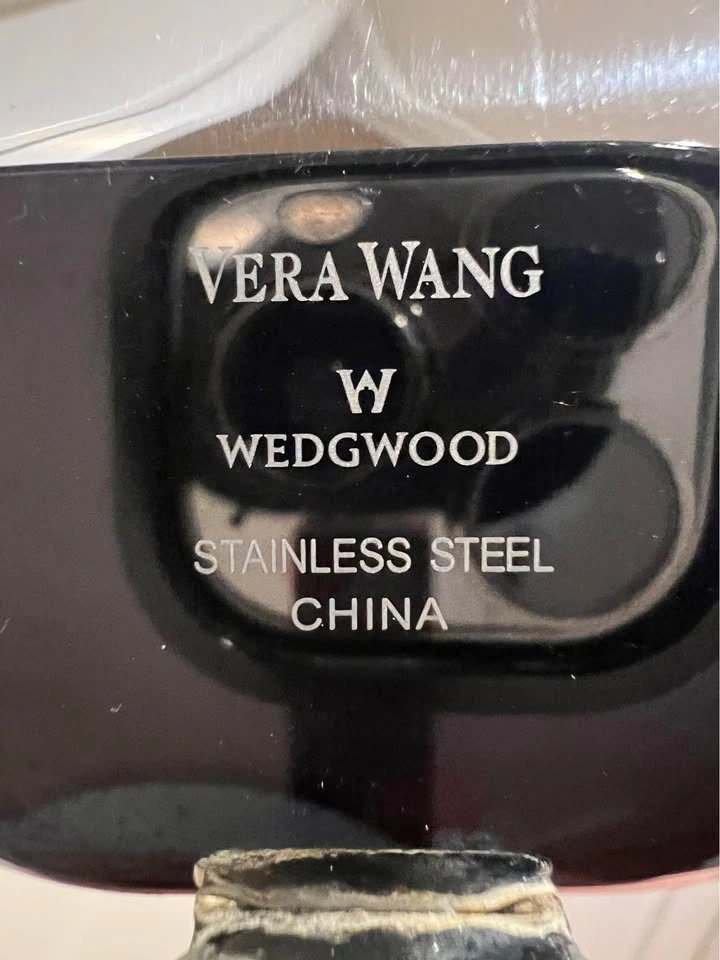 Elegant Vera Wang Wedgwood With Love Nouveau Pearl cake knife and server set. Features silver-plated handles with pearl-toned enamel and an interlocking ring motif. Set includes a 13.25" cake knife and an 11.5" cake server. Made of silver-plated metal with enamel accents. Hand wash only. Modern and sophisticated, perfect for weddings or as a bridal gift. Sold as is - some damage as shown in photos. Pickup at 58th and 7th Ave in midtown Manhattan.