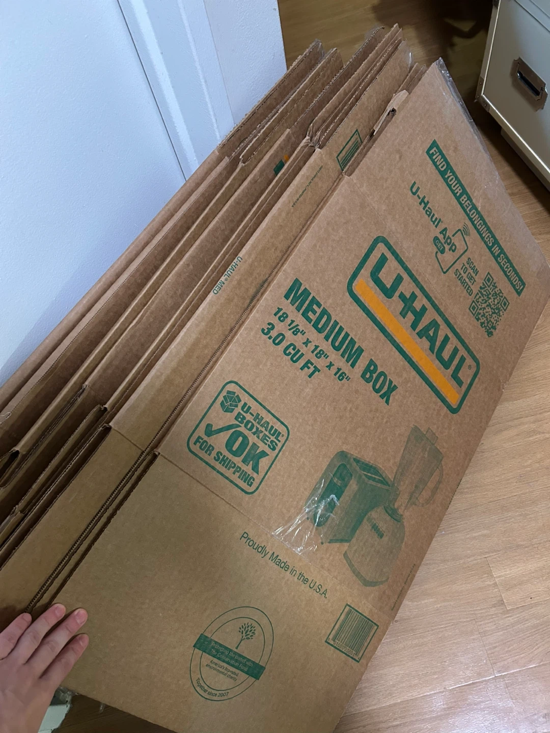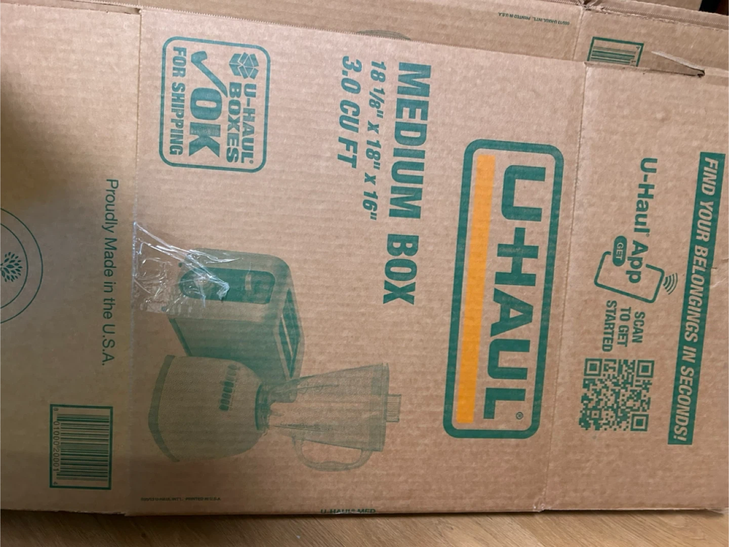 Giving away a set of 5 U-Haul medium moving boxes. Each box measures 18 1/8" x 18" x 16" with a volume of 3.0 cu ft. Proudly made in the U.S.A. Perfect for packing various household items during a move!