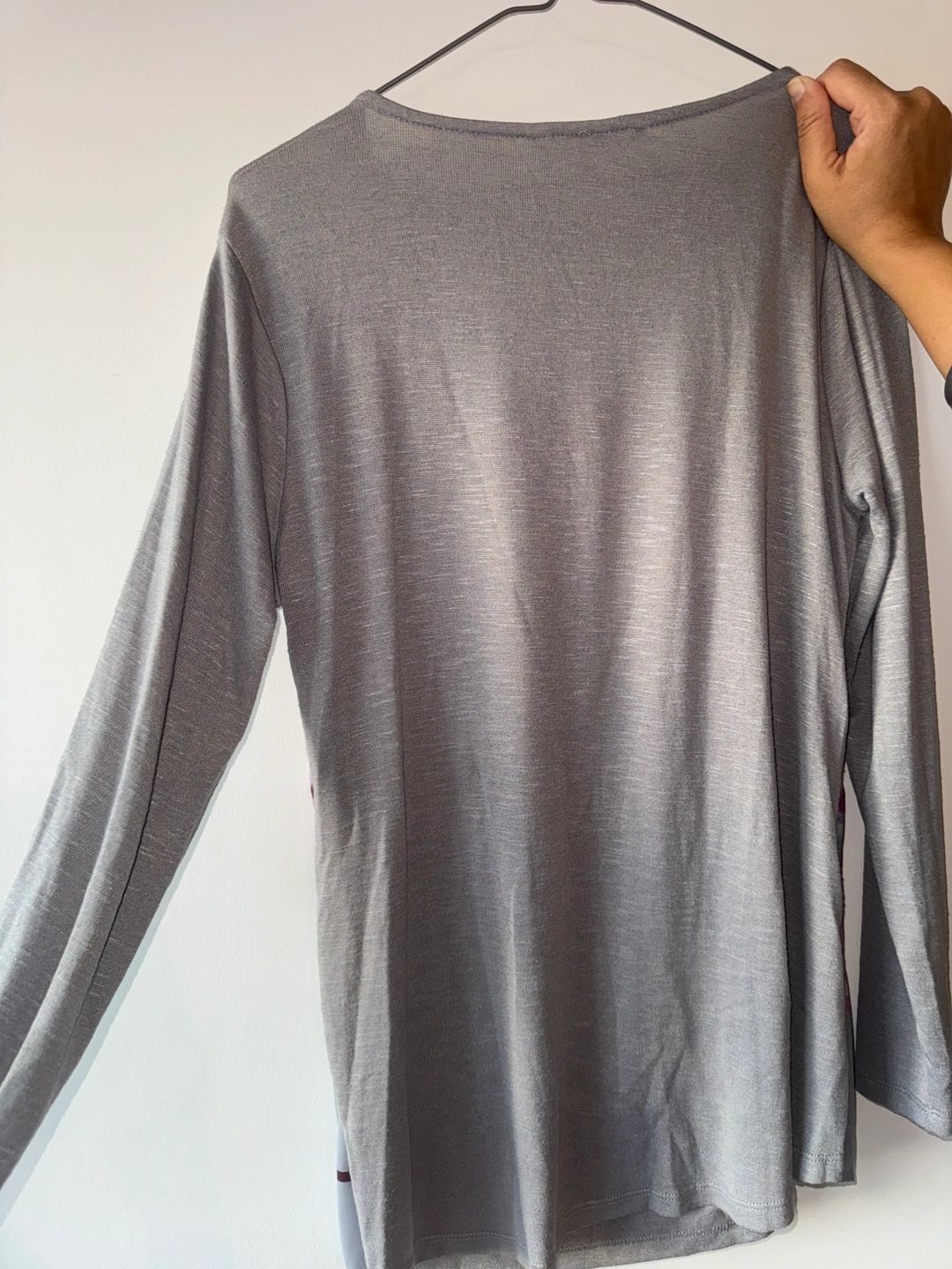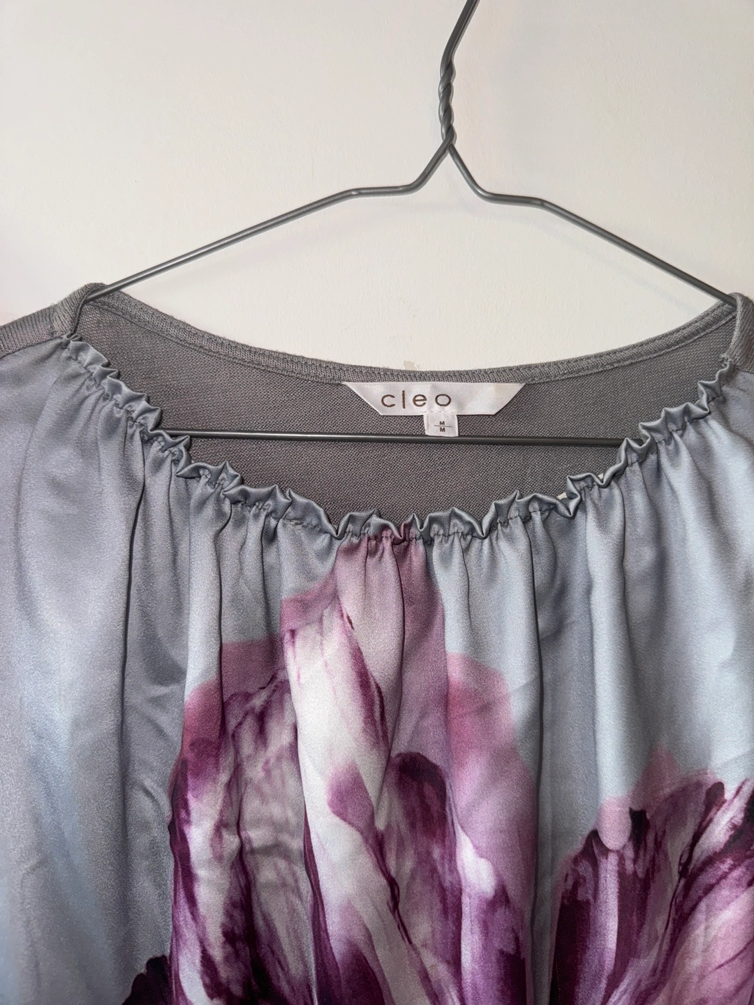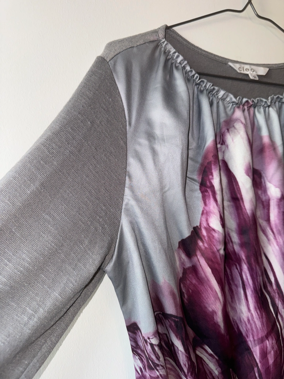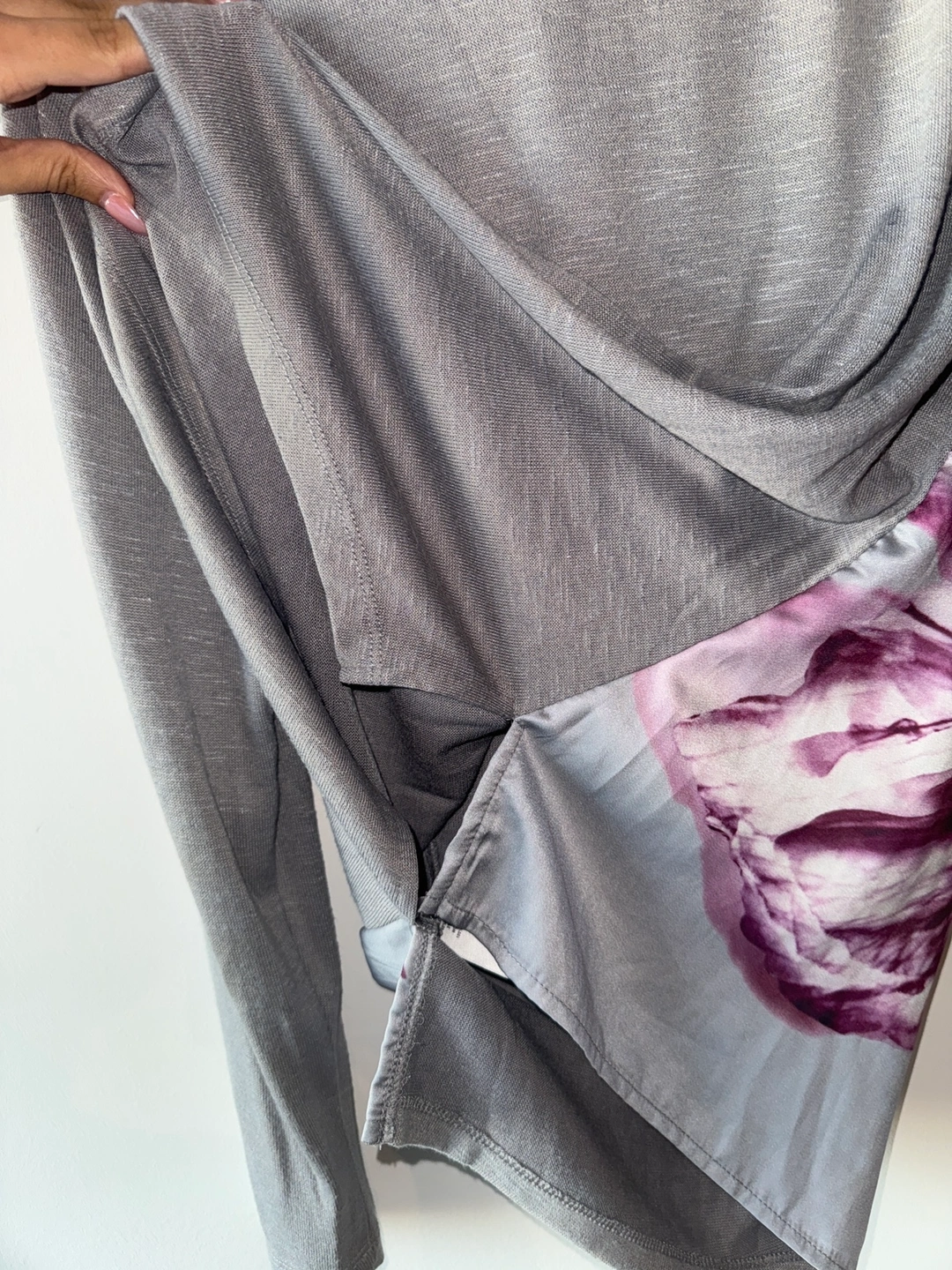 Grey long sleeve top with a floral print. The sleeves are long and fitted. The top has a gathered neckline. It has a unique design with a contrasting fabric on the front. It has a side slit.