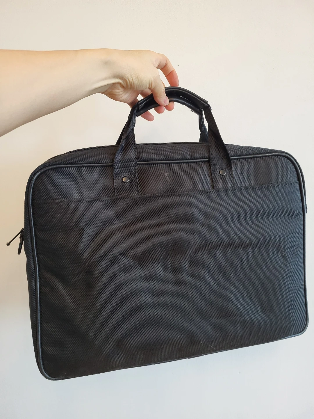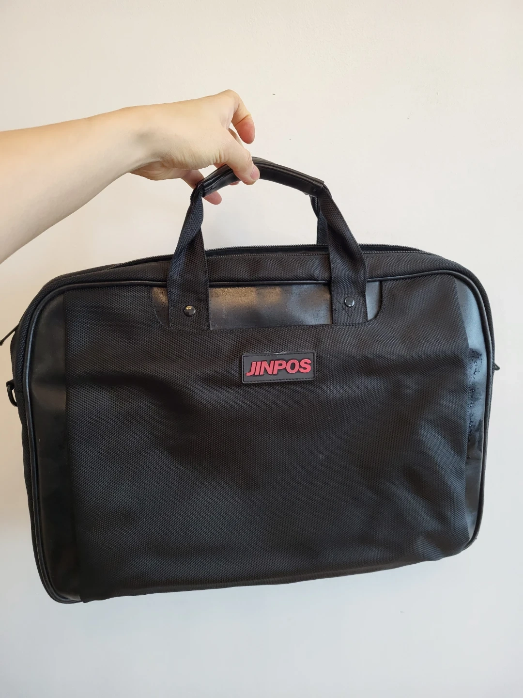This JINPOS briefcase is black and features a textured outer material with faux leather trim. It has a zippered main compartment and carrying handles. This bag is suitable for carrying documents and a laptop.