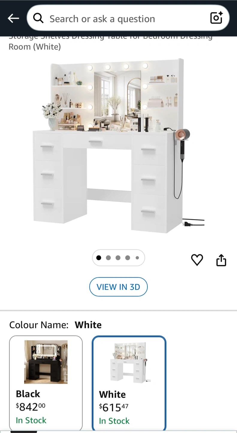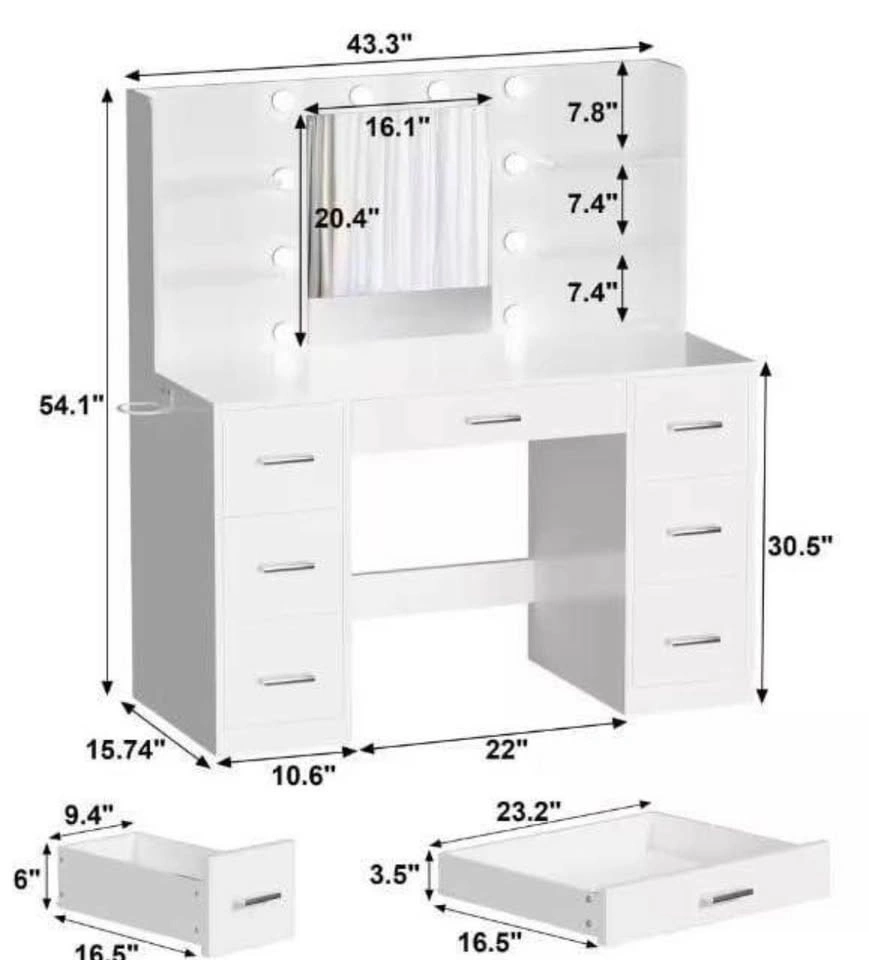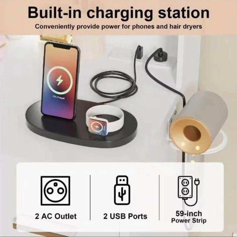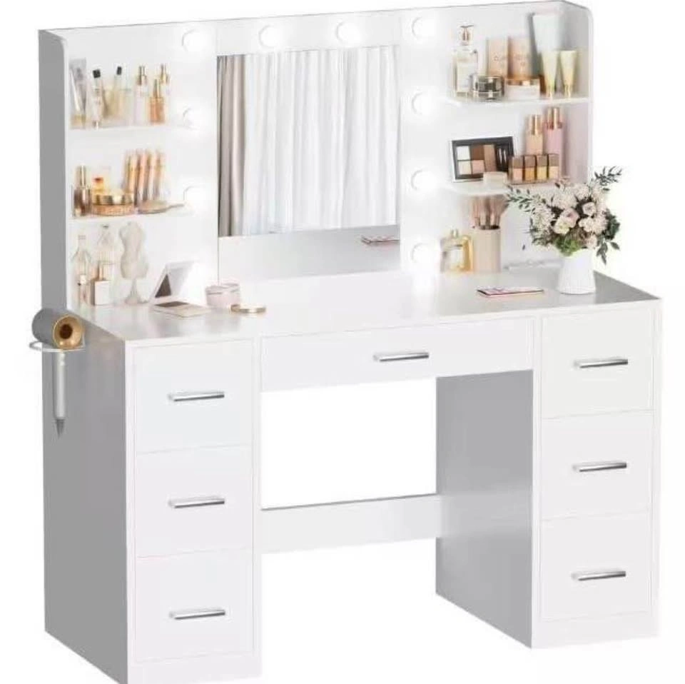 White Vanity with Lights (FN51356) β¨ Modern makeup vanity with a large mirror & 10 LED bulbs (3 light modes). Comes with 7 drawers, open shelves, a hair-dryer holder, plus built-in USB ports & power outlets. Stylish, spacious, and perfect for daily glam. (Stool sold separately)