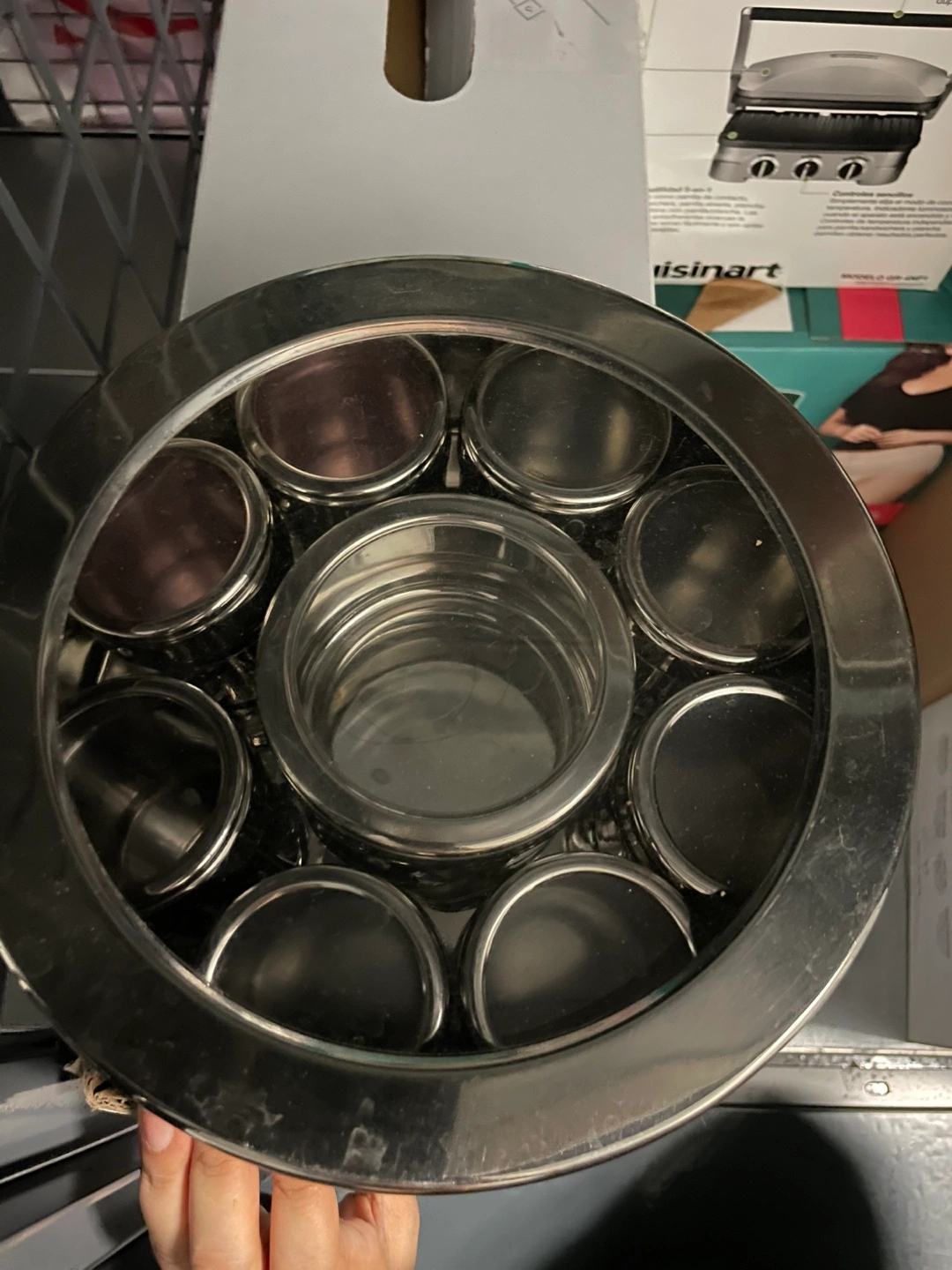 Never used. Selling a Cuisinart spice rack! It's in great condition and ready to organize your spices. comes with different small containers with there individual lids so that spices don’t mix up.