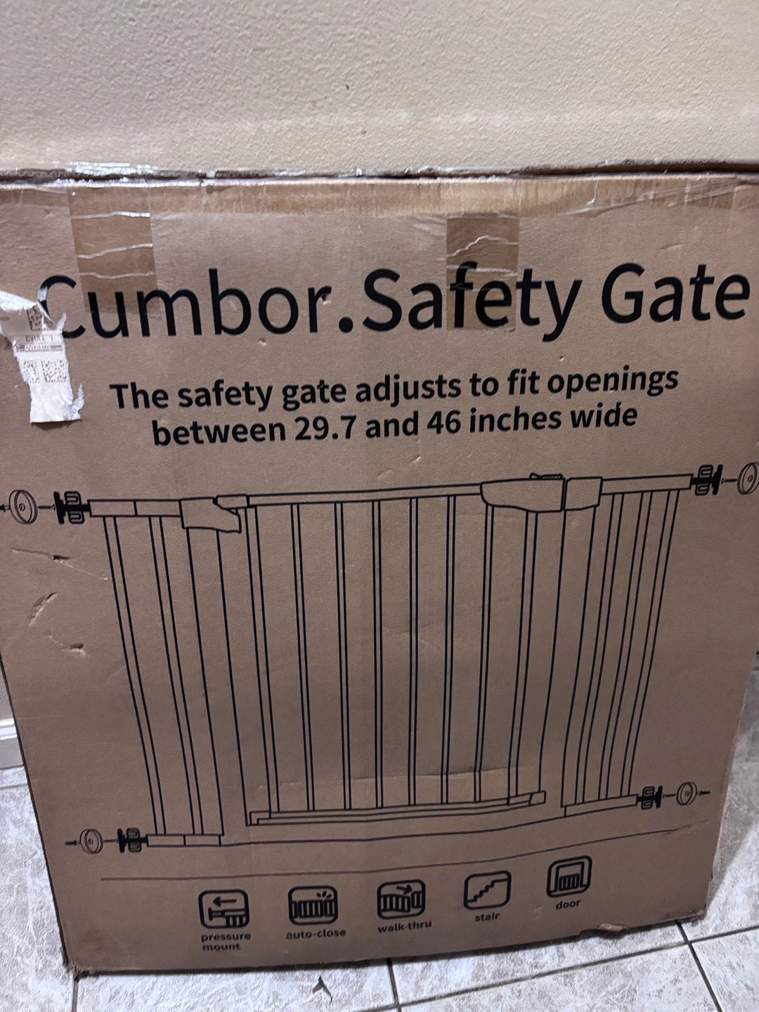 Selling a Cumbor Safety Gate that adjusts to fit openings between 29.7 and 46 inches wide! It can be used as a pressure mount, auto-close, walk-thru, stair, or door gate. The box is included Brand new. Color white