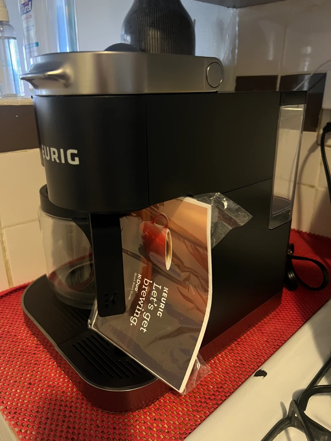 Black Keurig Duo coffee maker with a carafe. It has a detachable drip tray and a water reservoir on the side. Includes the user manual.