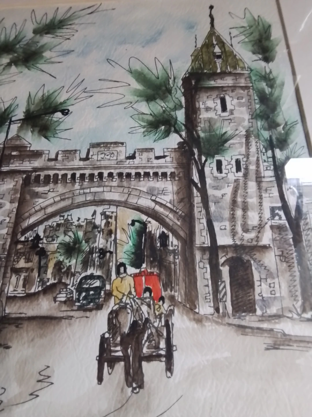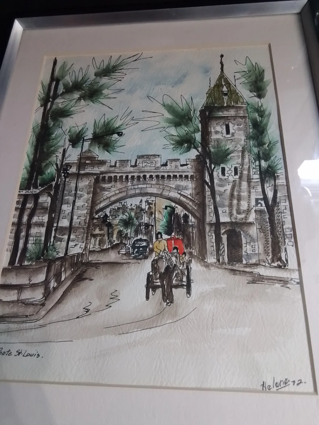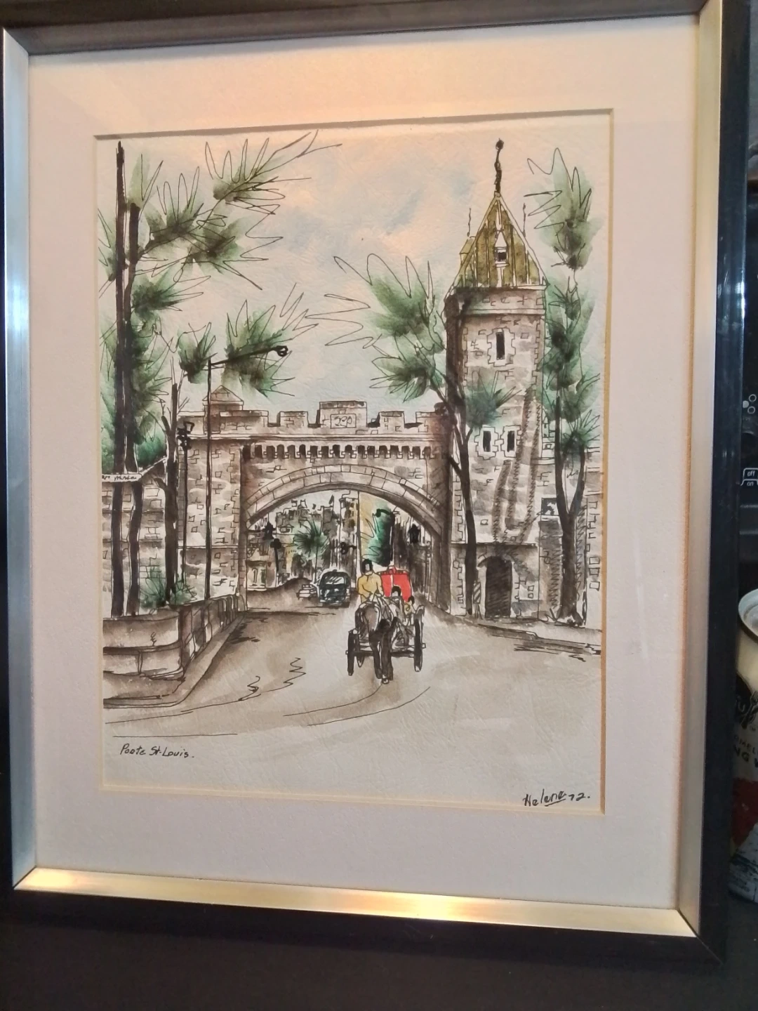 This is a charming watercolor painting depicting "Poorte St-Louis" by artist Helene, dated "72.". It features a historical scene with a carriage and stone architecture. The artwork is framed and ready to hang.