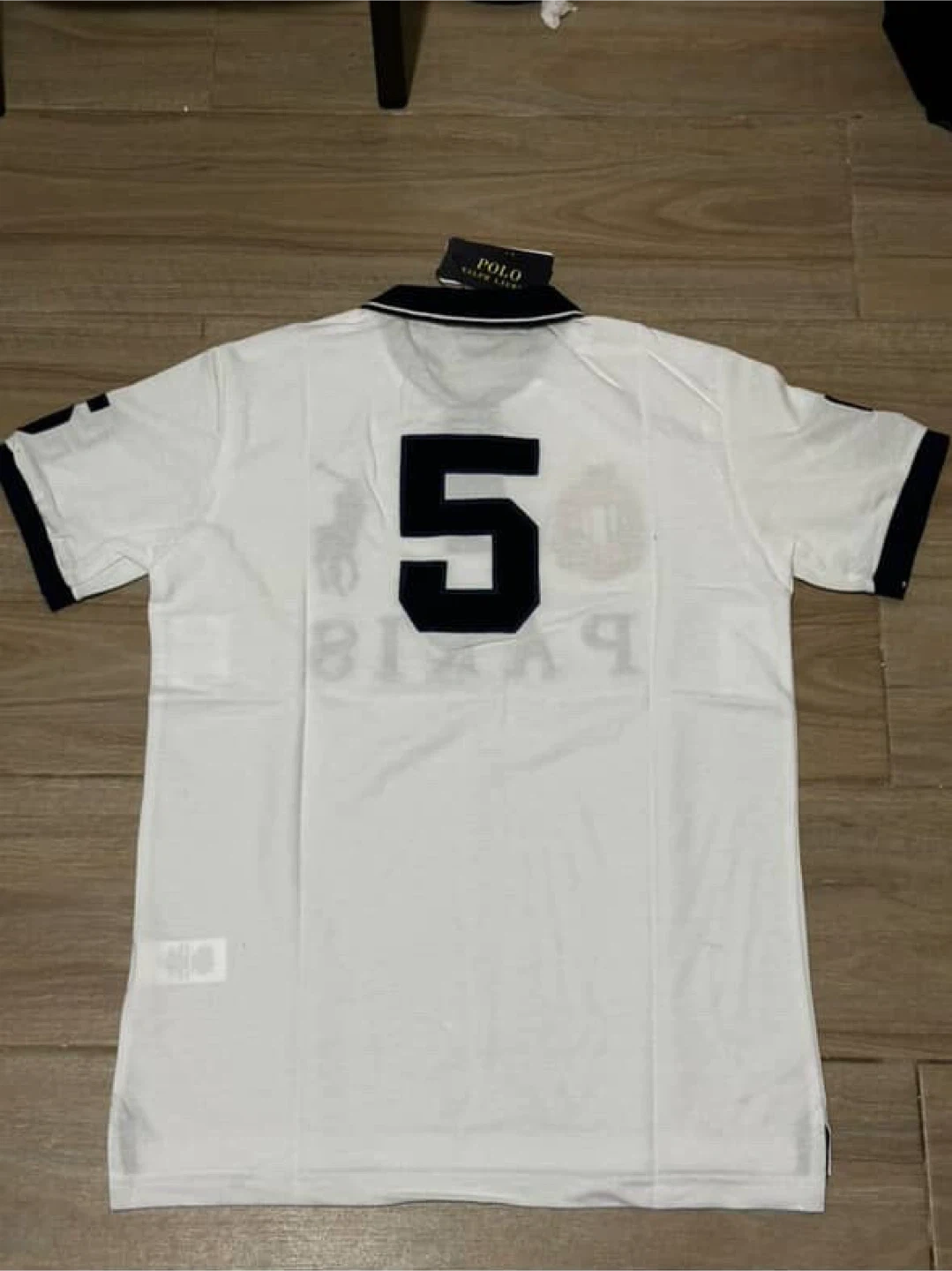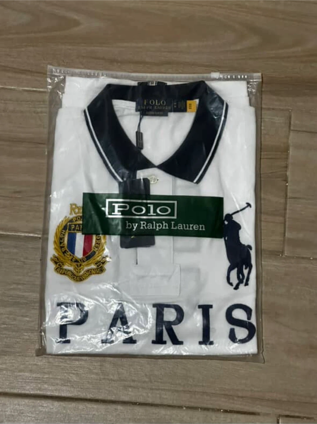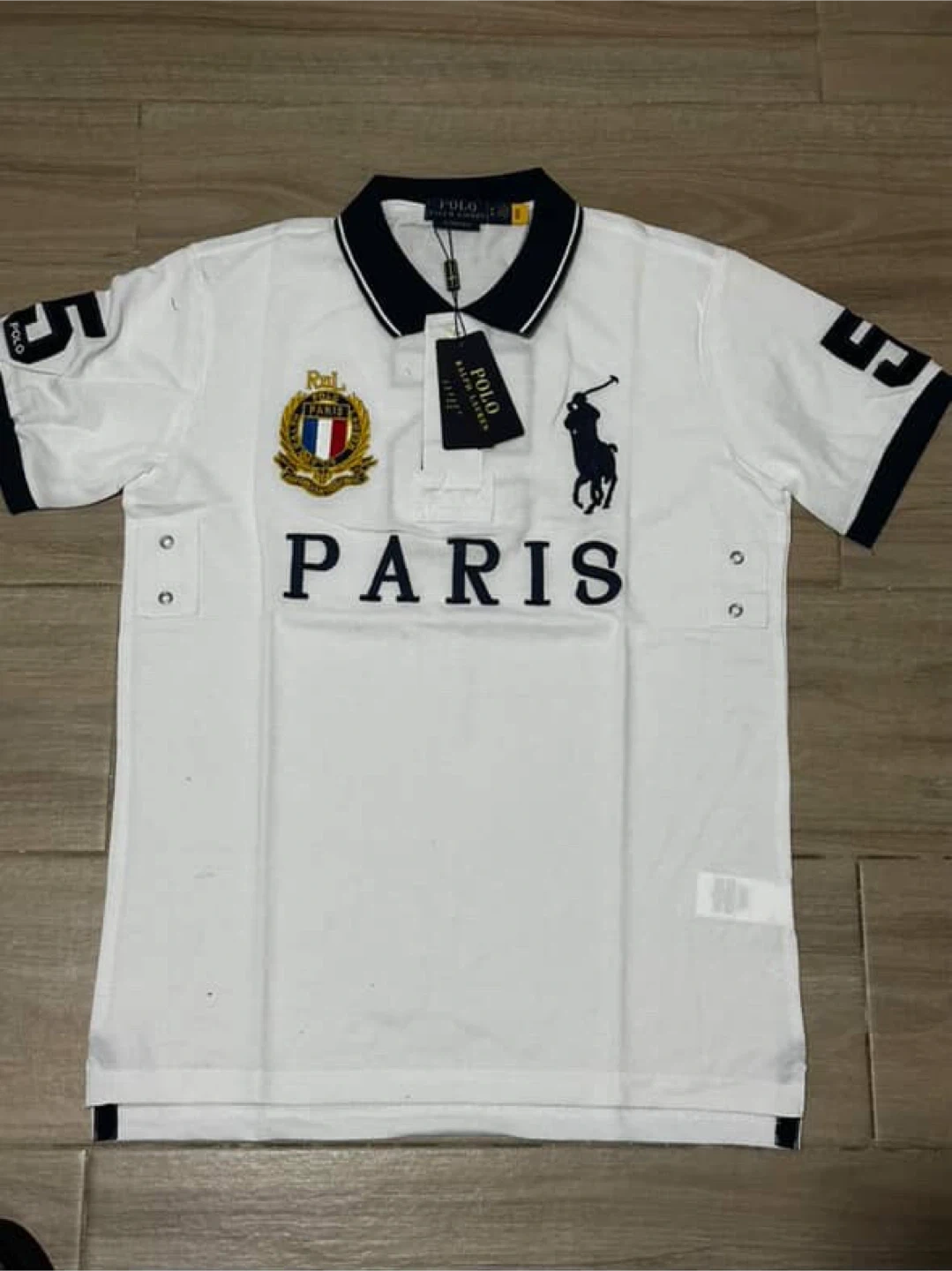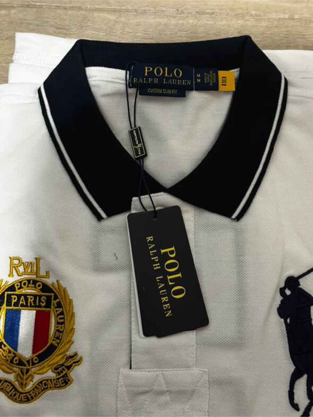 Selling a brand new Polo Ralph Lauren polo shirt! It's a custom slim fit, size medium, and features a stylish "Paris" design. The shirt is white with a black collar and navy accents. It is still in its original packaging with tags attached, so it's in perfect condition
