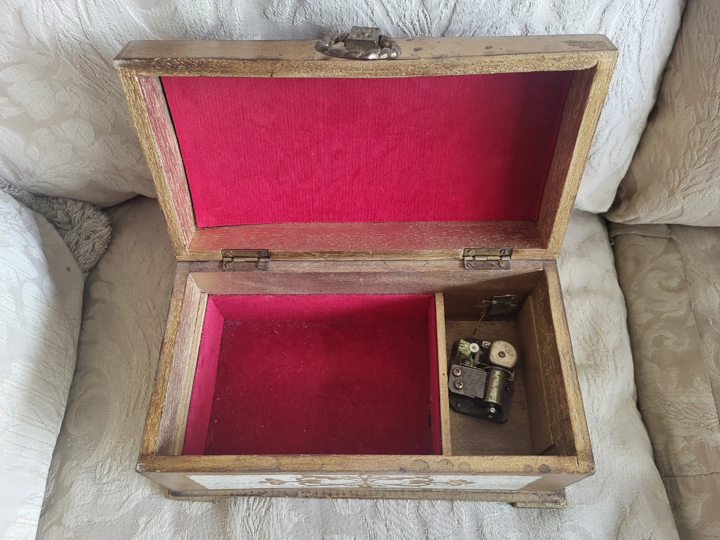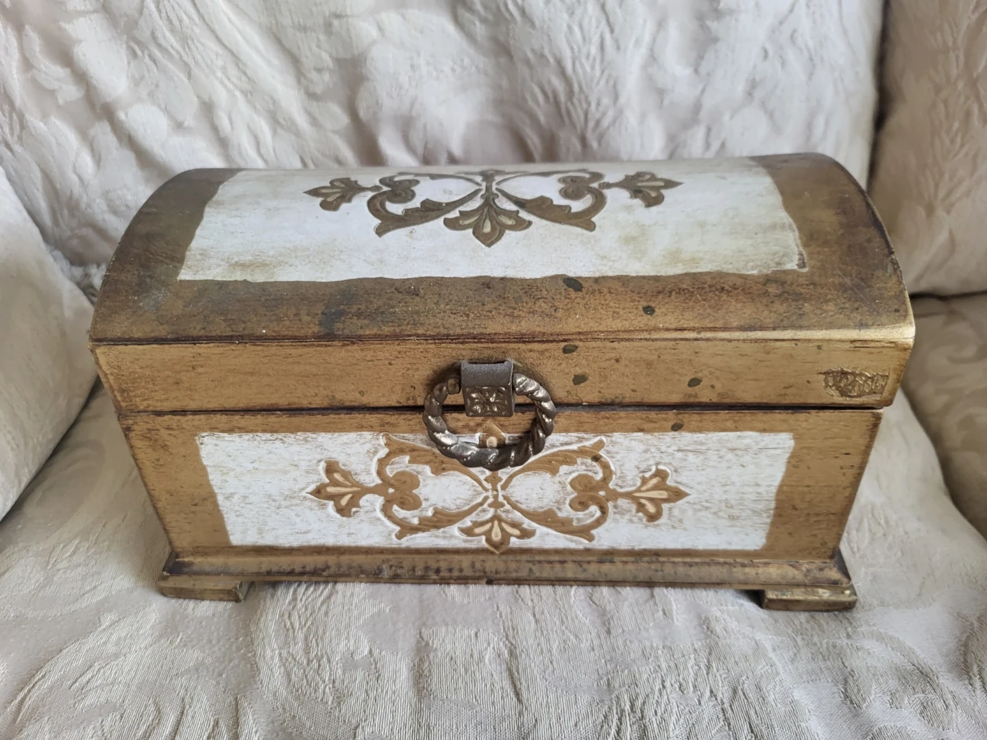 This is a decorative music box with a vintage look. It has a gold and white distressed finish with ornate scrollwork. Inside, it features a red velvet lining and a music mechanism. It's a lovely piece for storing small treasures or as a decorative accent!