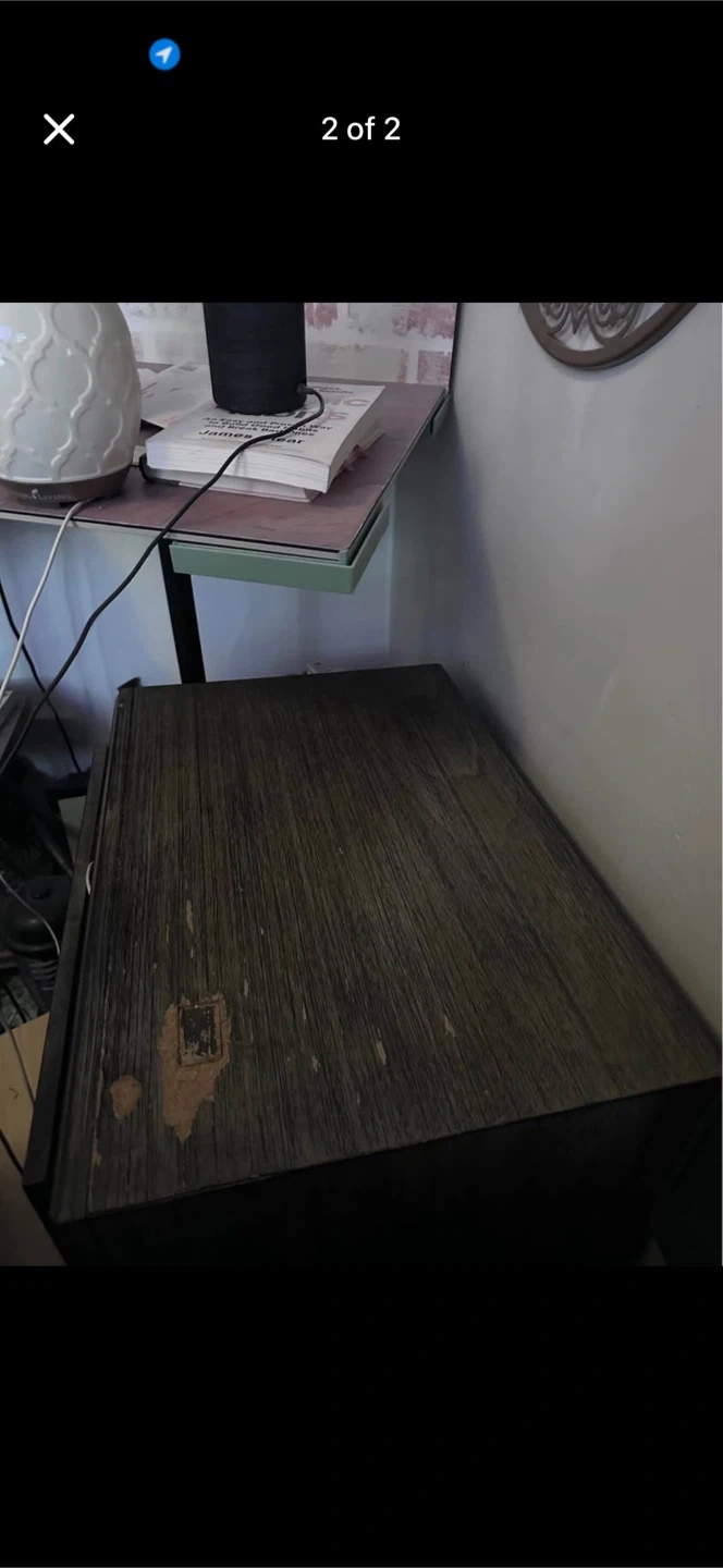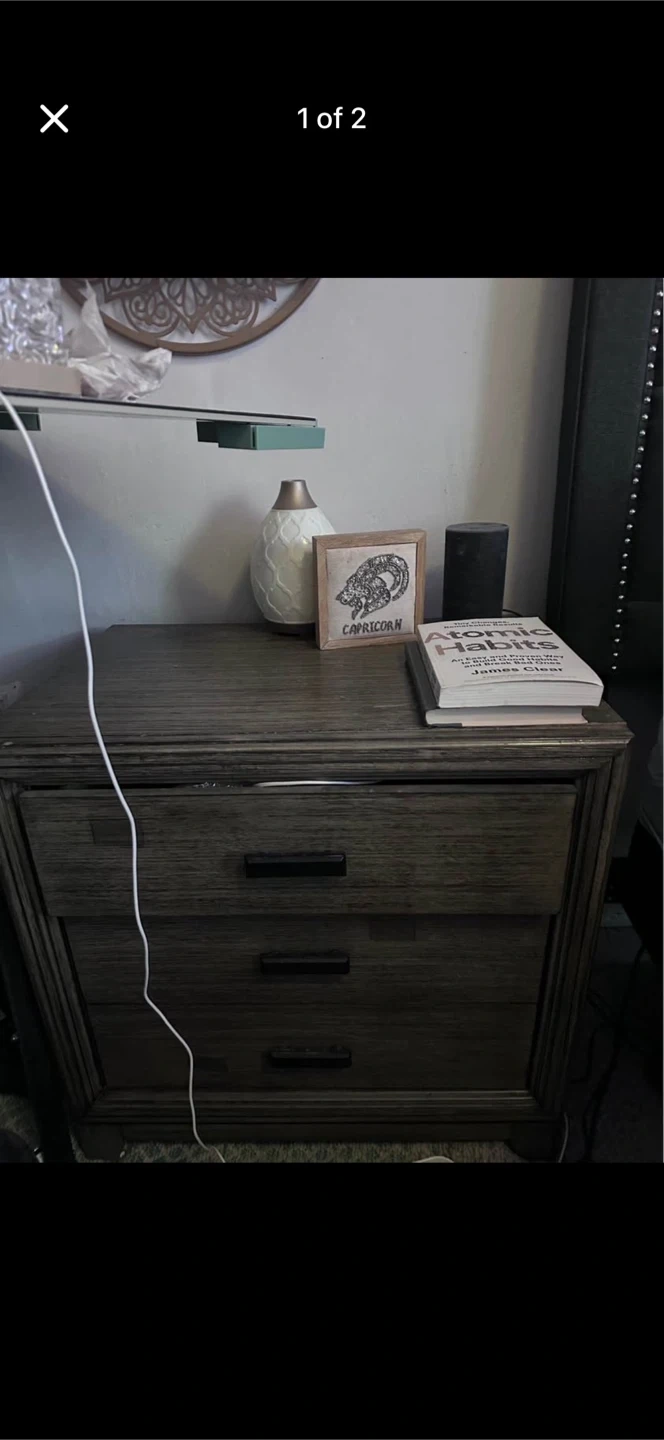 This wooden nightstand features three drawers for storage. It has a dark wood finish. Great for bedroom organization!