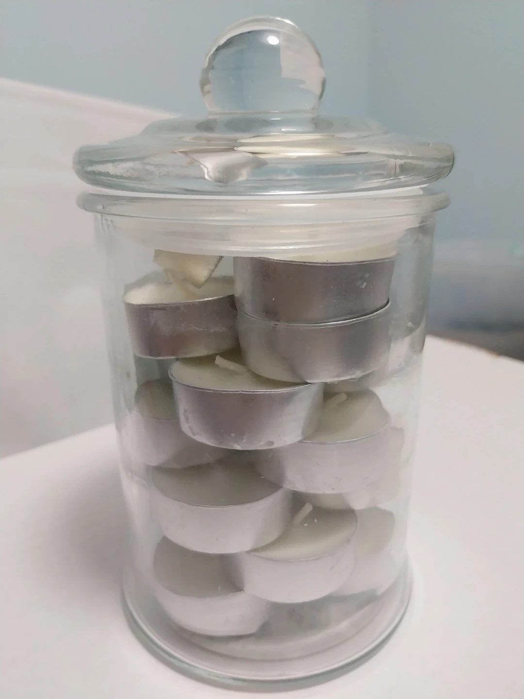 This set includes 21 Watson's brand tealight candles in a reusable glass jar. They're a white tea scent. The candles are packaged in a clear glass apothecary jar with a lid. The jar itself is a nice decorative piece once the candles are used.