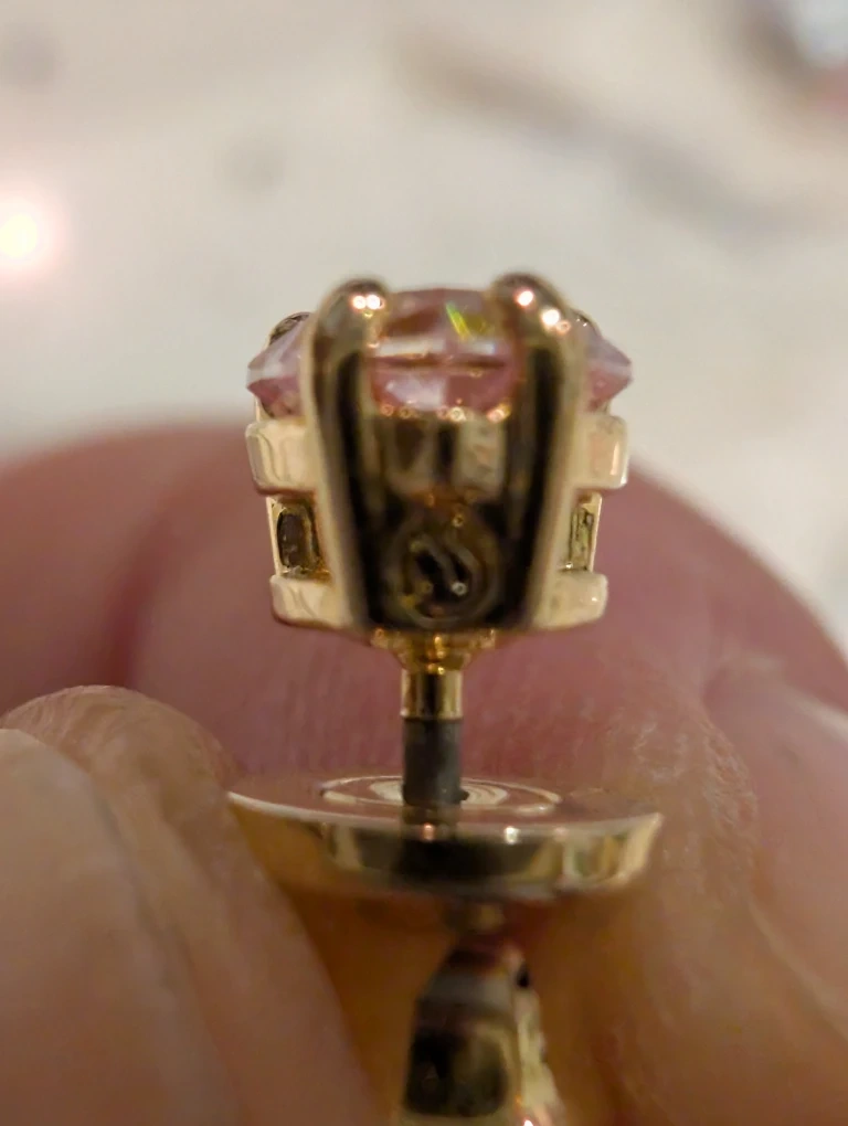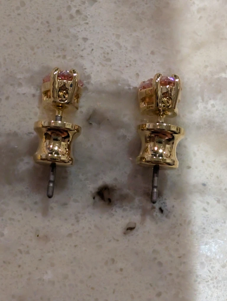 These are a pair of Swarovski earrings with a pink heart-shaped stone. The metal appears to be gold-toned plated zirconia, they have swan 🦢 mark , Chroma Collection.