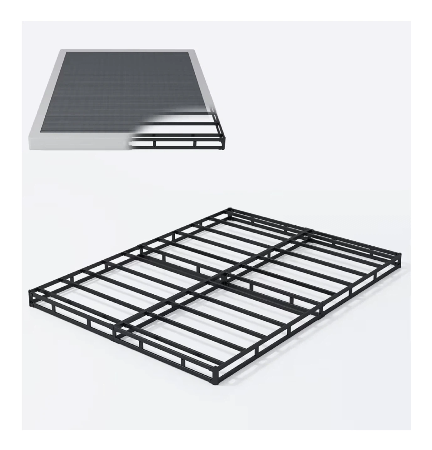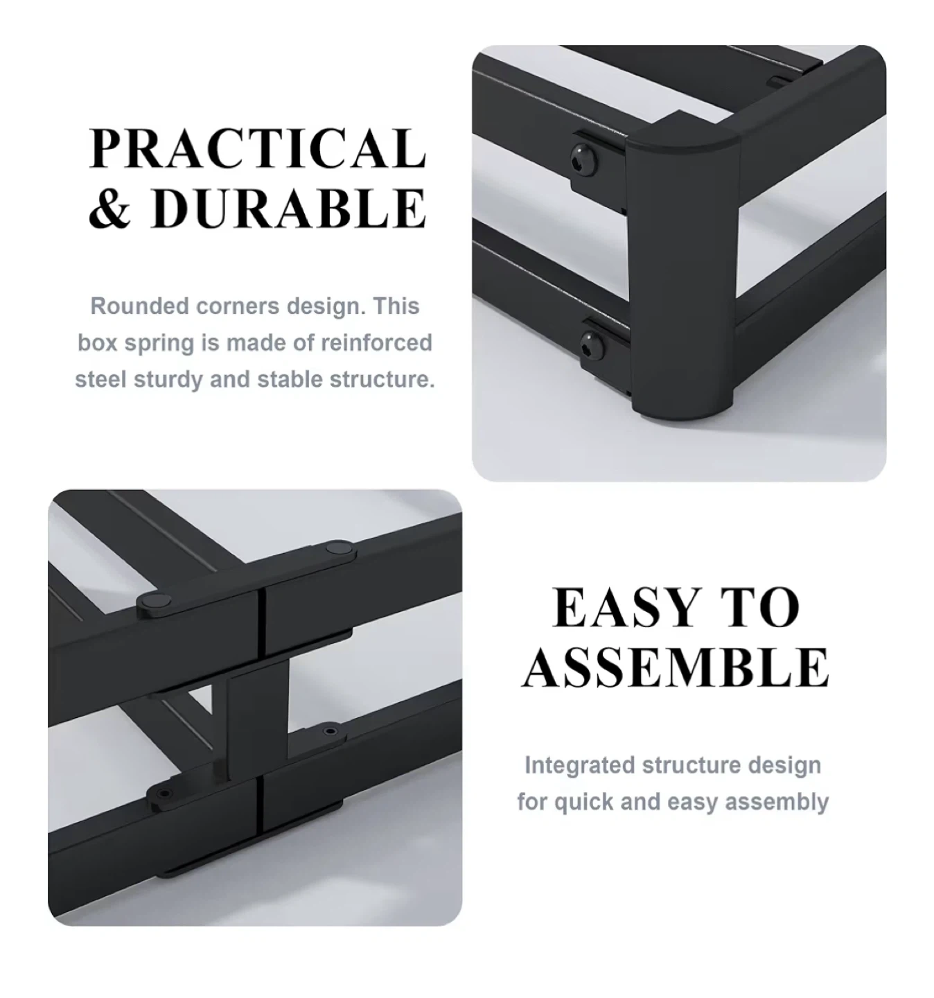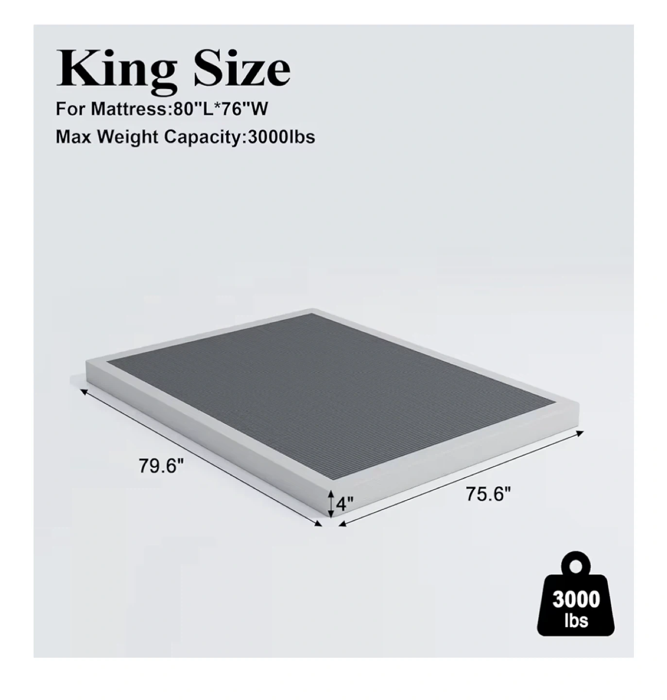 This is a king-size bed frame with a steel sturdy and stable structure. It features a removable, easy-to-clean fabric cover and an integrated structure design for quick assembly. Max weight capacity is 3000 lbs.