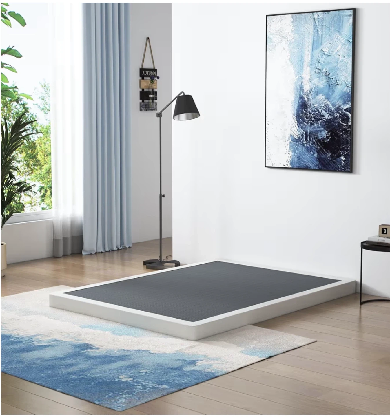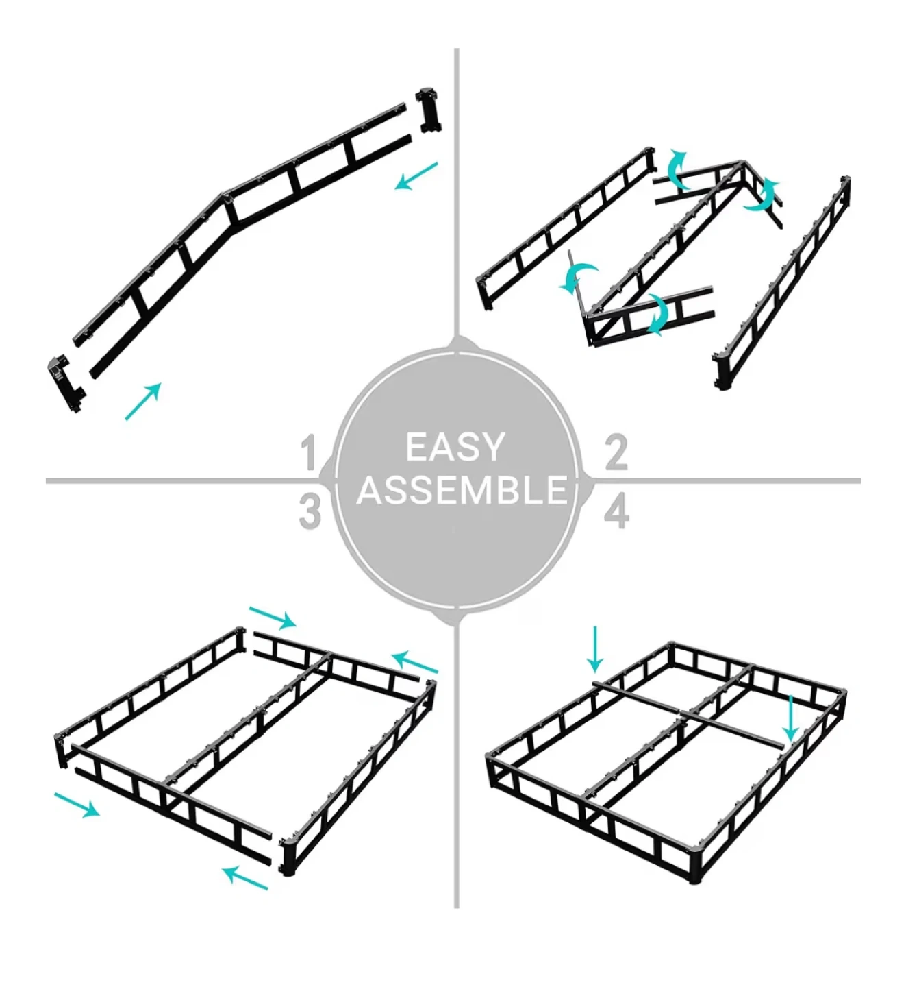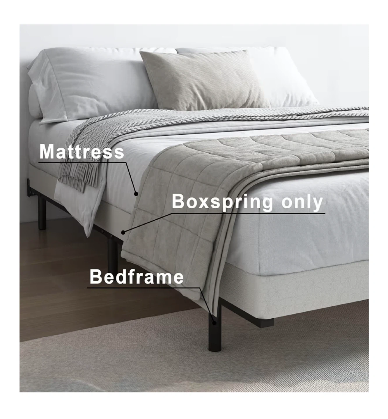 This is a king-size bed frame with a steel sturdy and stable structure. It features a removable, easy-to-clean fabric cover and an integrated structure design for quick assembly. Max weight capacity is 3000 lbs.