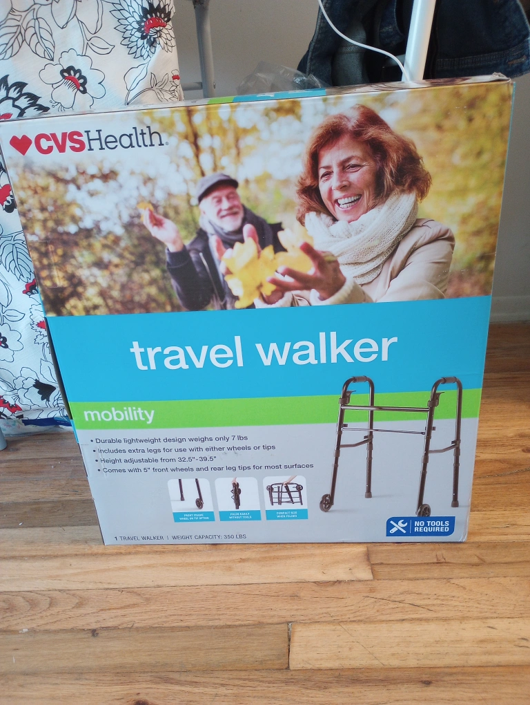Selling a CVS Health travel walker! It's lightweight, weighing only 7 lbs, and has a durable design. It includes extra legs for use with either wheels or tips, and the height is adjustable from 32.5" to 39.5". It also comes with 5" front wheels and rear leg tips for most surfaces