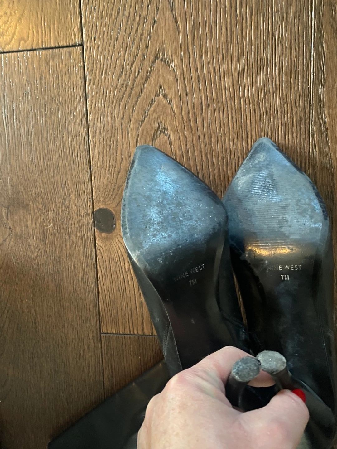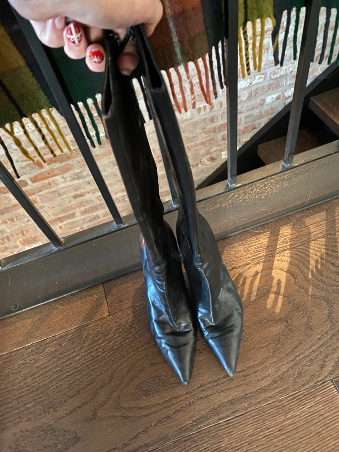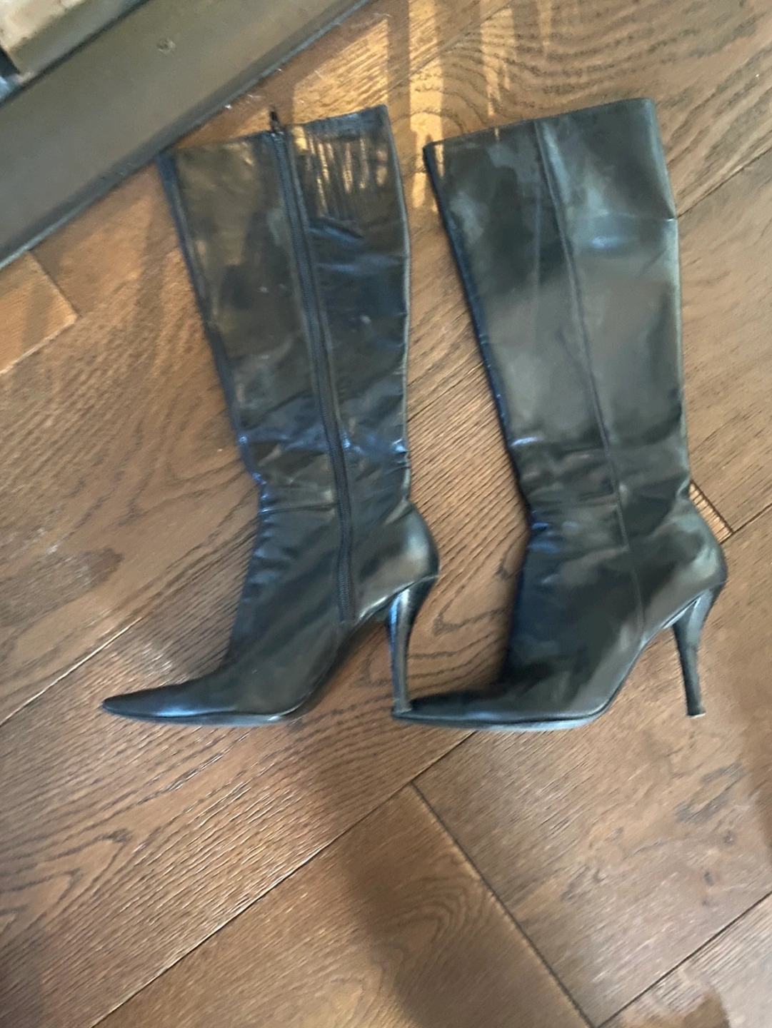 Pair of Nine West black leather knee-high boots. Pointed-toe stiletto heels. Back zipper closure. Size 7M.