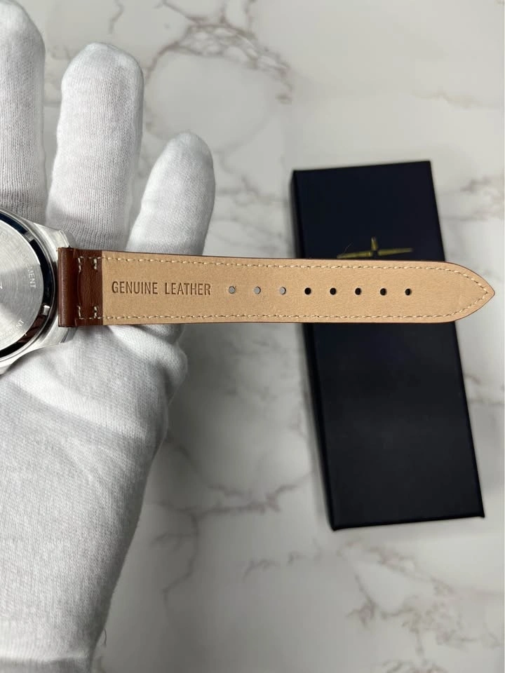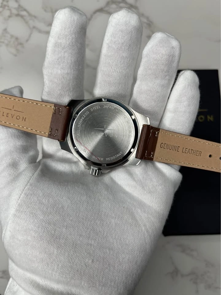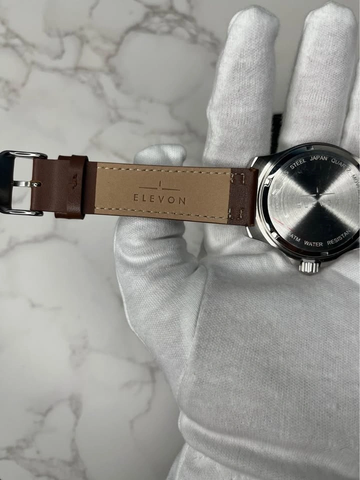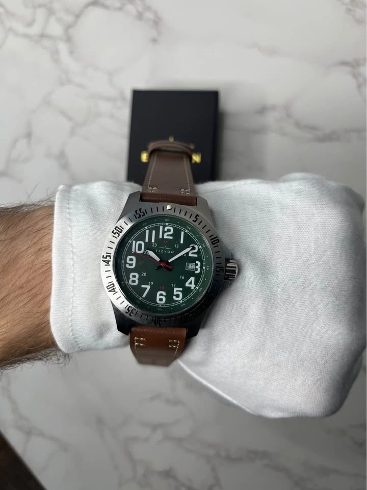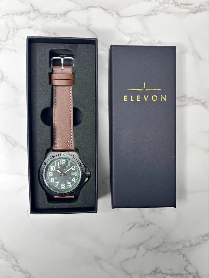 New Elevon Aviator watch with a green dial and brown genuine leather strap. Features a stainless steel case, Japan quartz movement, and is water resistant 5ATM. Comes in original box. Pick up in Brooklyn 11230.