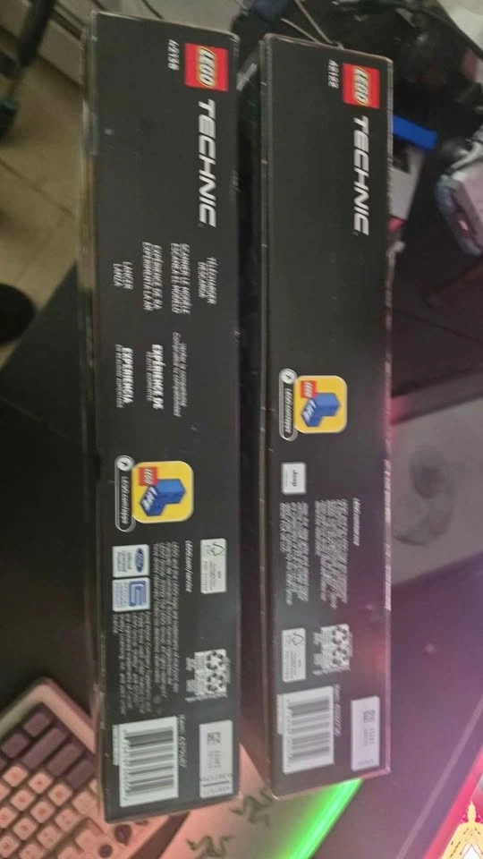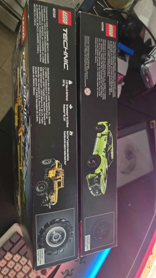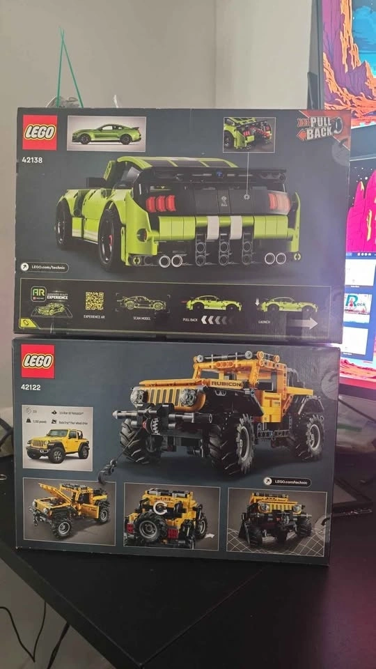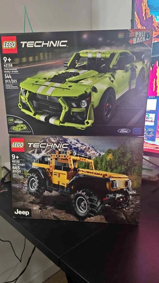Lego Technic sets: 42122 Jeep Wrangler ($55) and 42138 Ford Mustang Shelby GT500 ($45). Both are new, sealed boxes. The glue came off on one side of the Jeep box, but I guarantee everything inside is new and unopened.