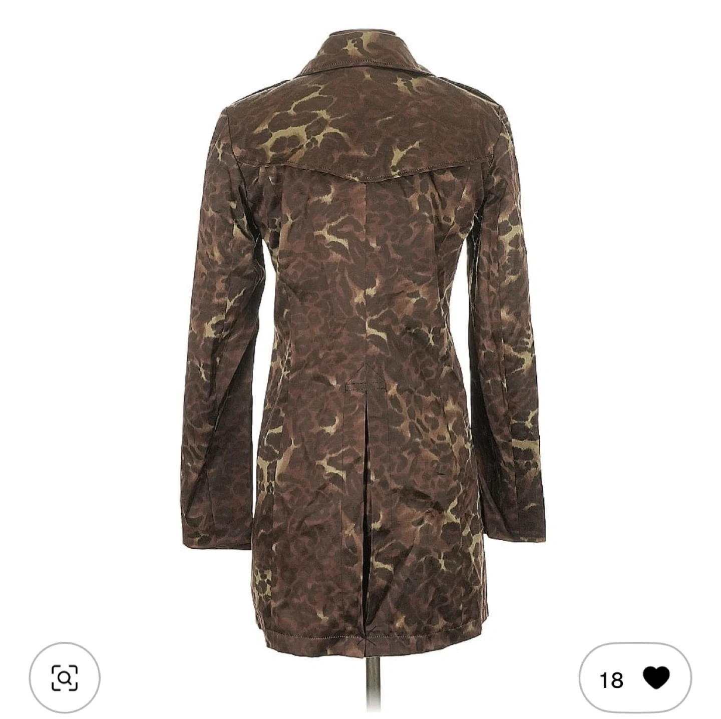 This stylish trench coat features a bold leopard print. It's a classic button-up design with a collared neckline and long sleeves. The material appears to be a polyester blend.