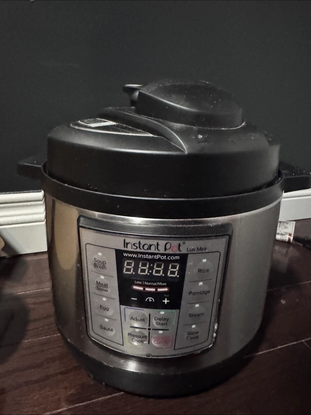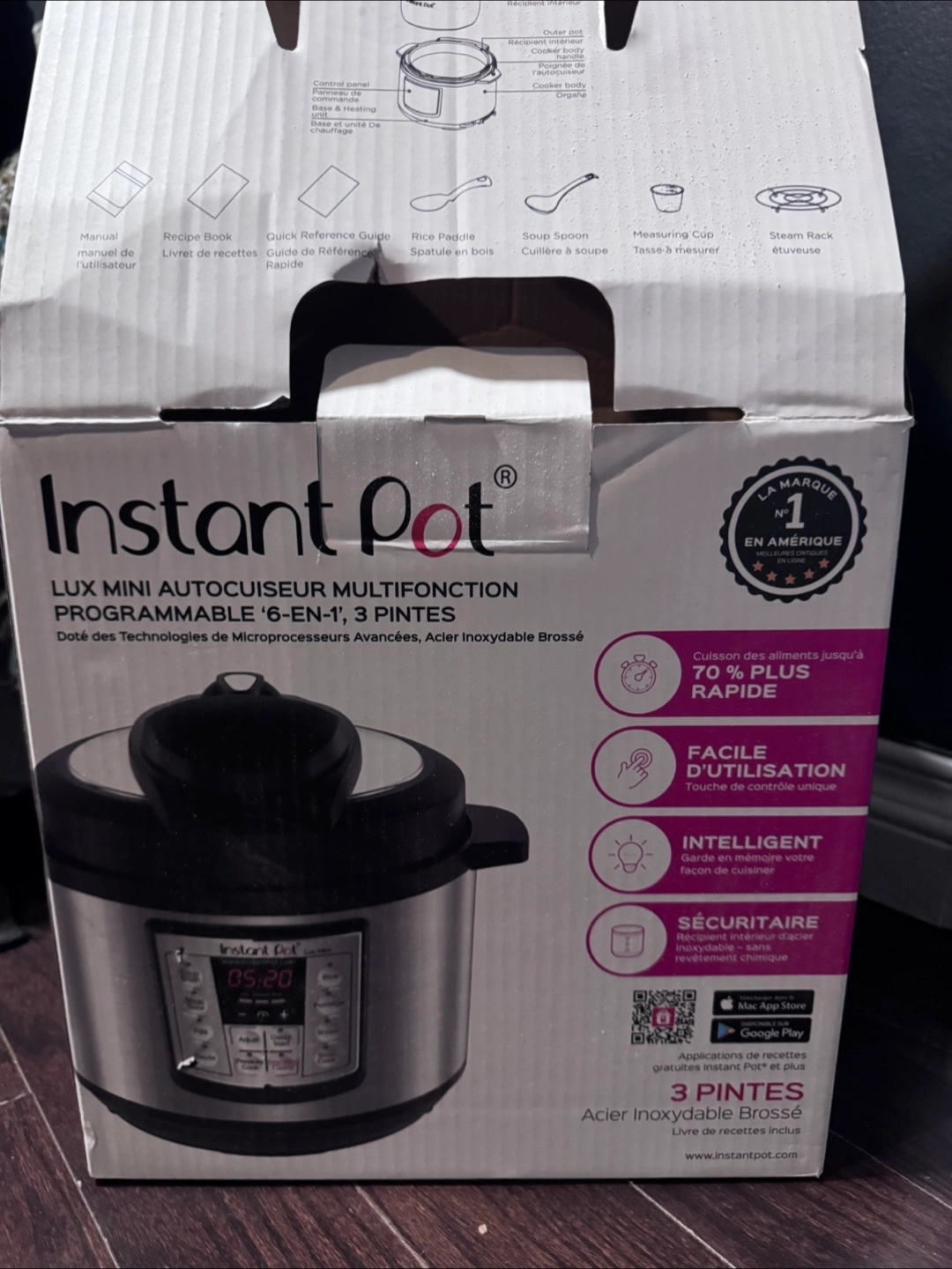 Instant Pot Lux Mini 3-quart multi-functional programmable pressure cooker. Stainless steel inner pot. Includes various cooking functions. Minor cosmetic wear.