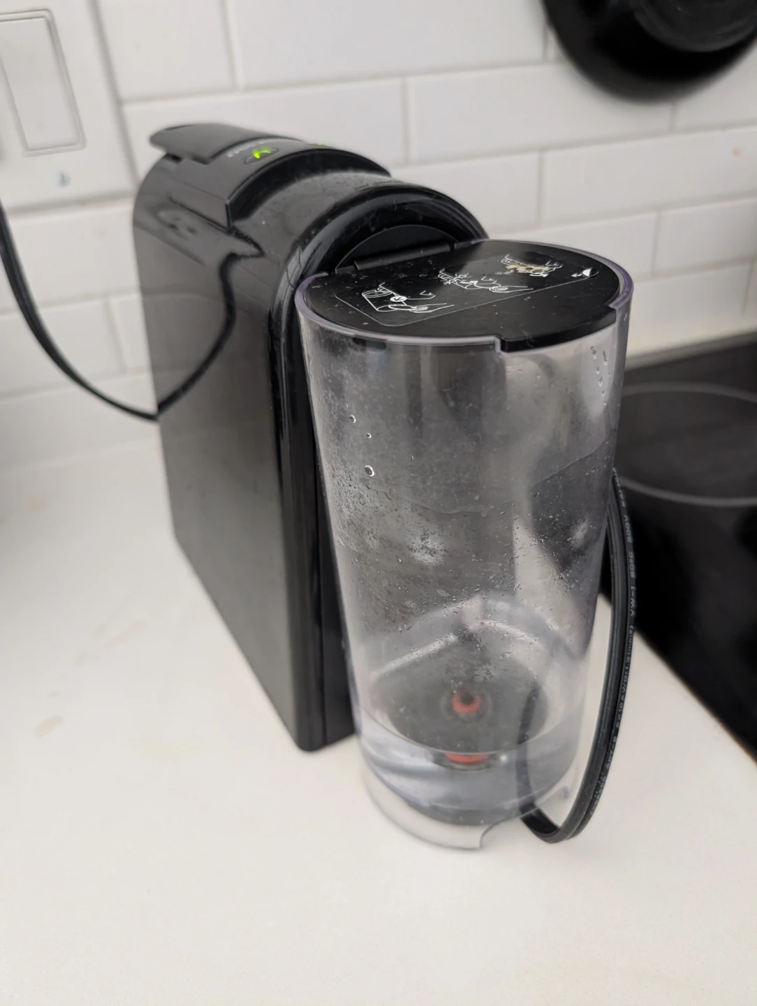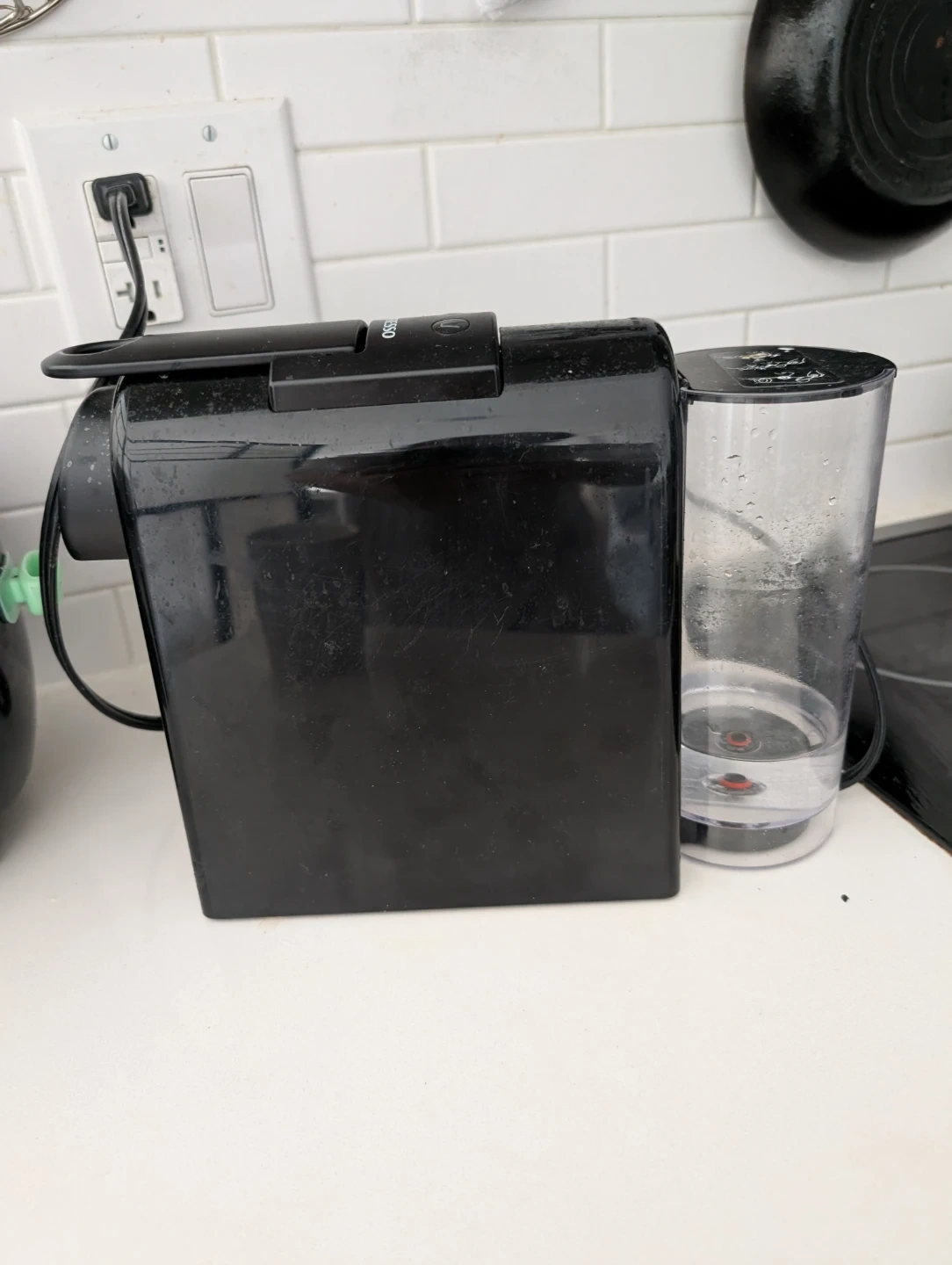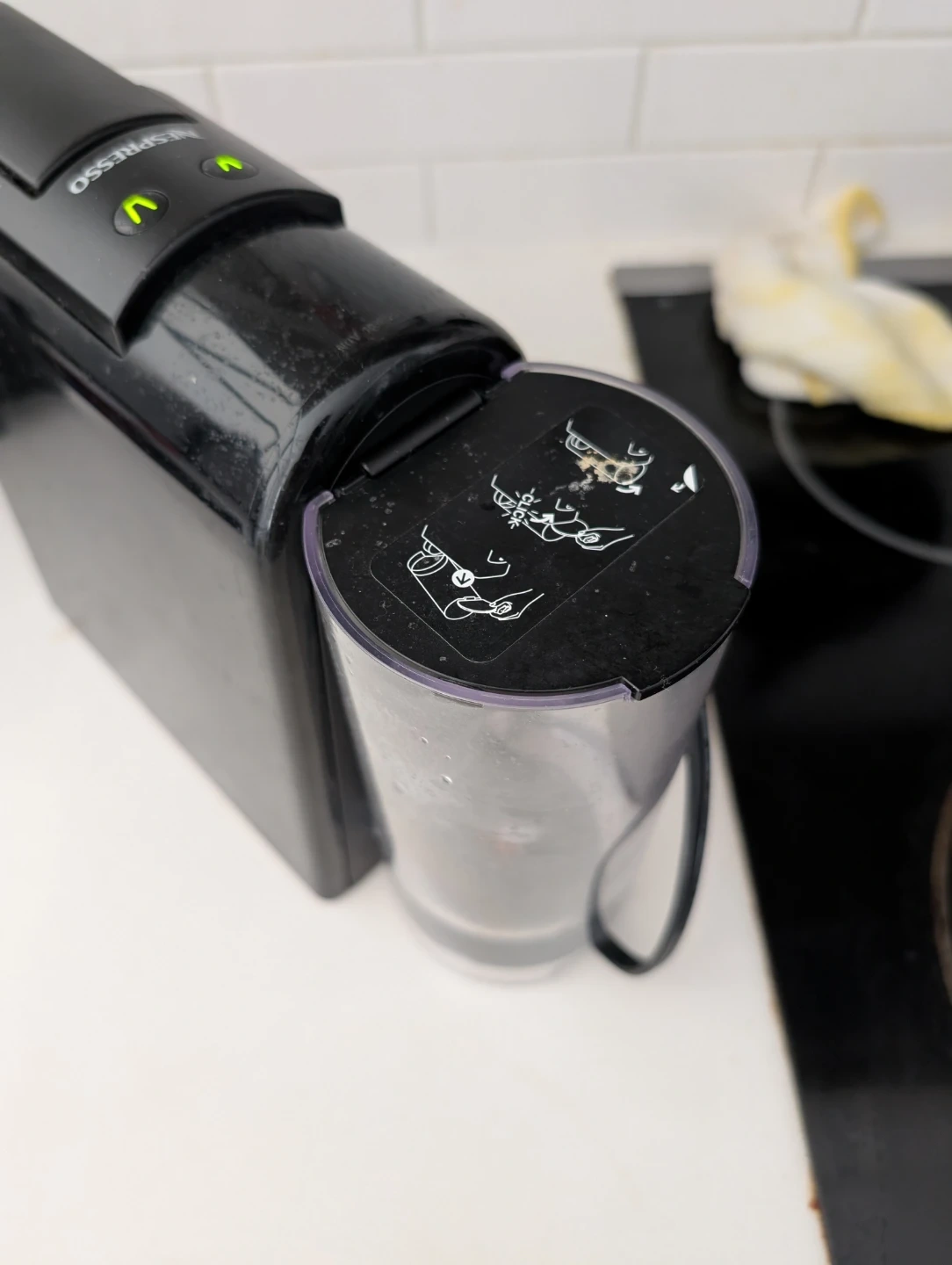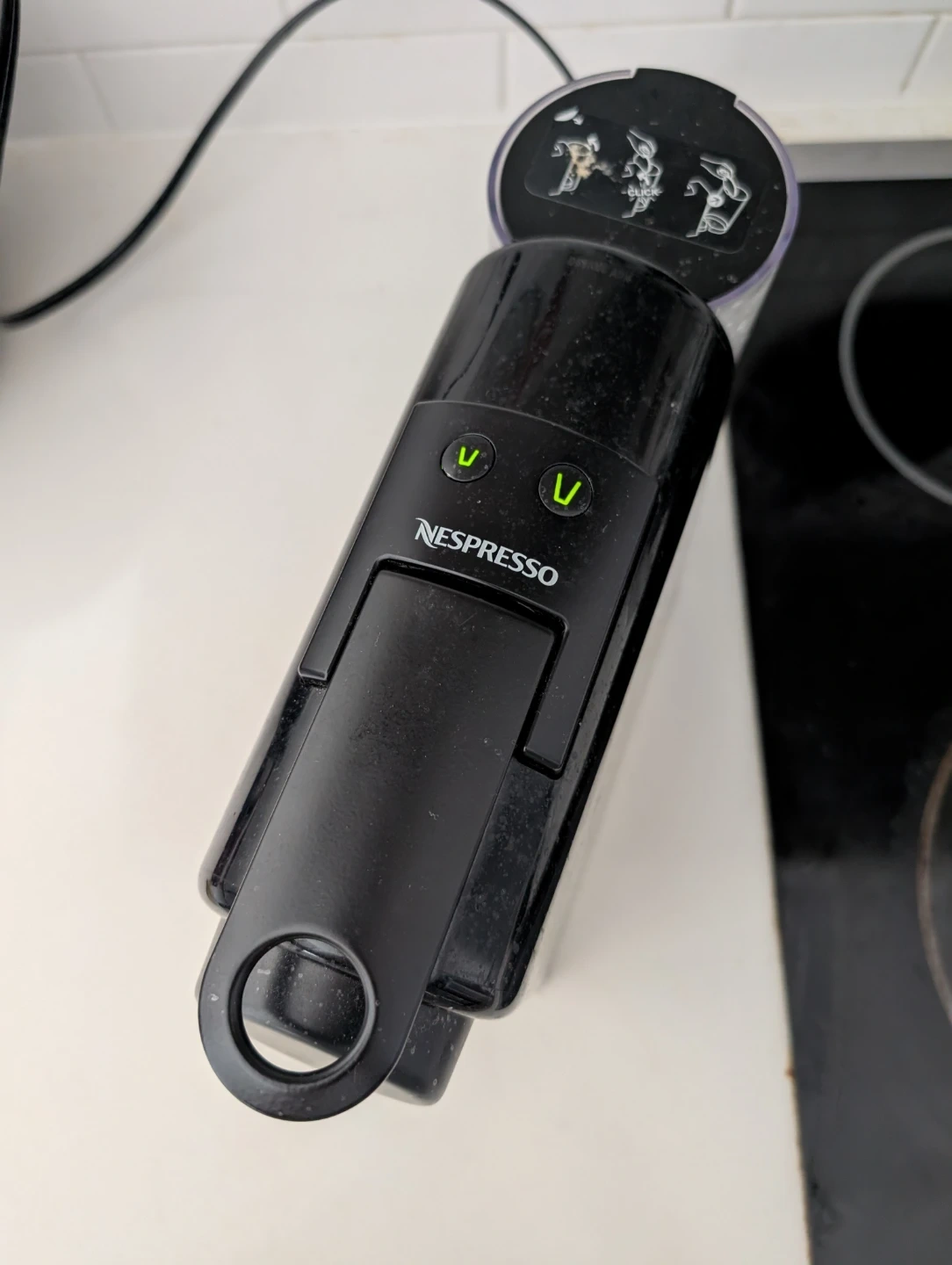 This is a black Nespresso Essenza Mini espresso machine. It's compact and easy to use. The water tank is detachable.