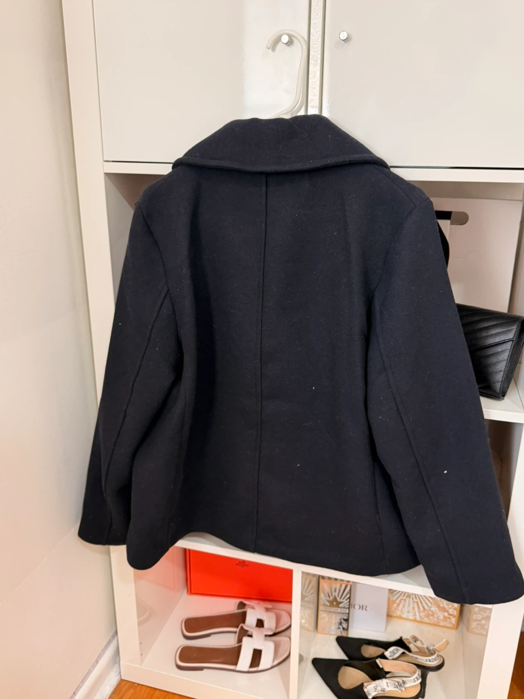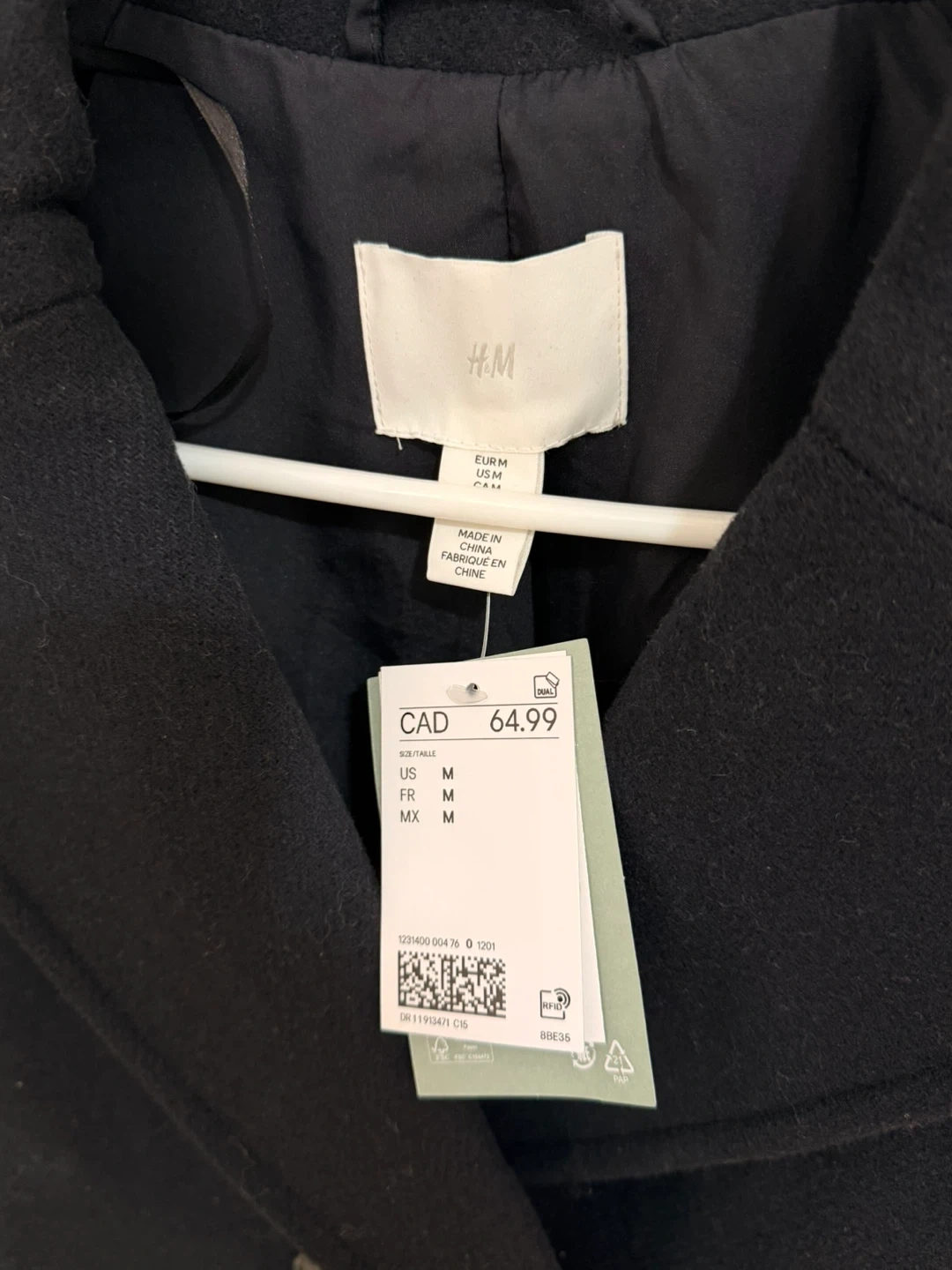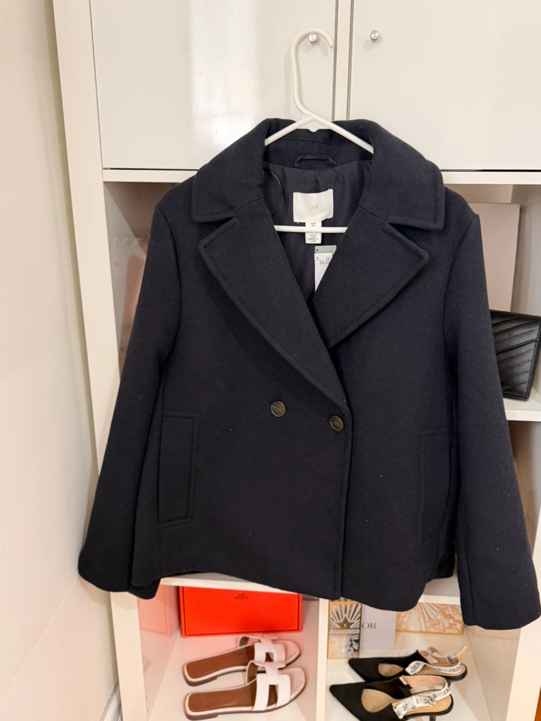 This H&M peacoat is a classic navy blue with a double-breasted front. It's a size medium, perfect for cooler weather. This stylish coat is ready for a new home!
